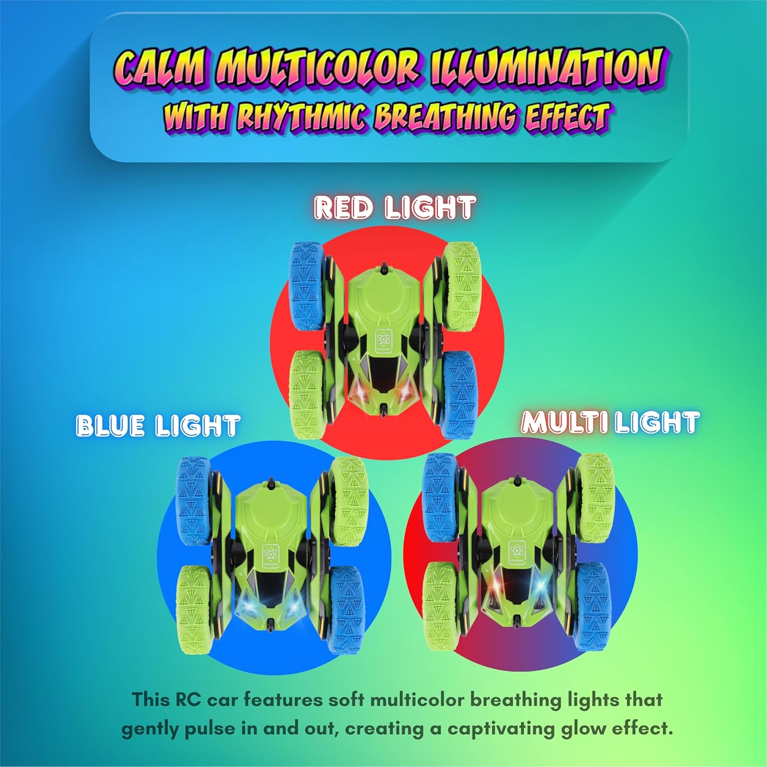 All-Round Drive Stunt RC Car - 360° Spins, High-Speed Off-Road with LED Headlights, 2 Rechargeable Batteries, AAA Remote Batteries, All-Terrain for Kids 6+ & Adults (Green & Blue)