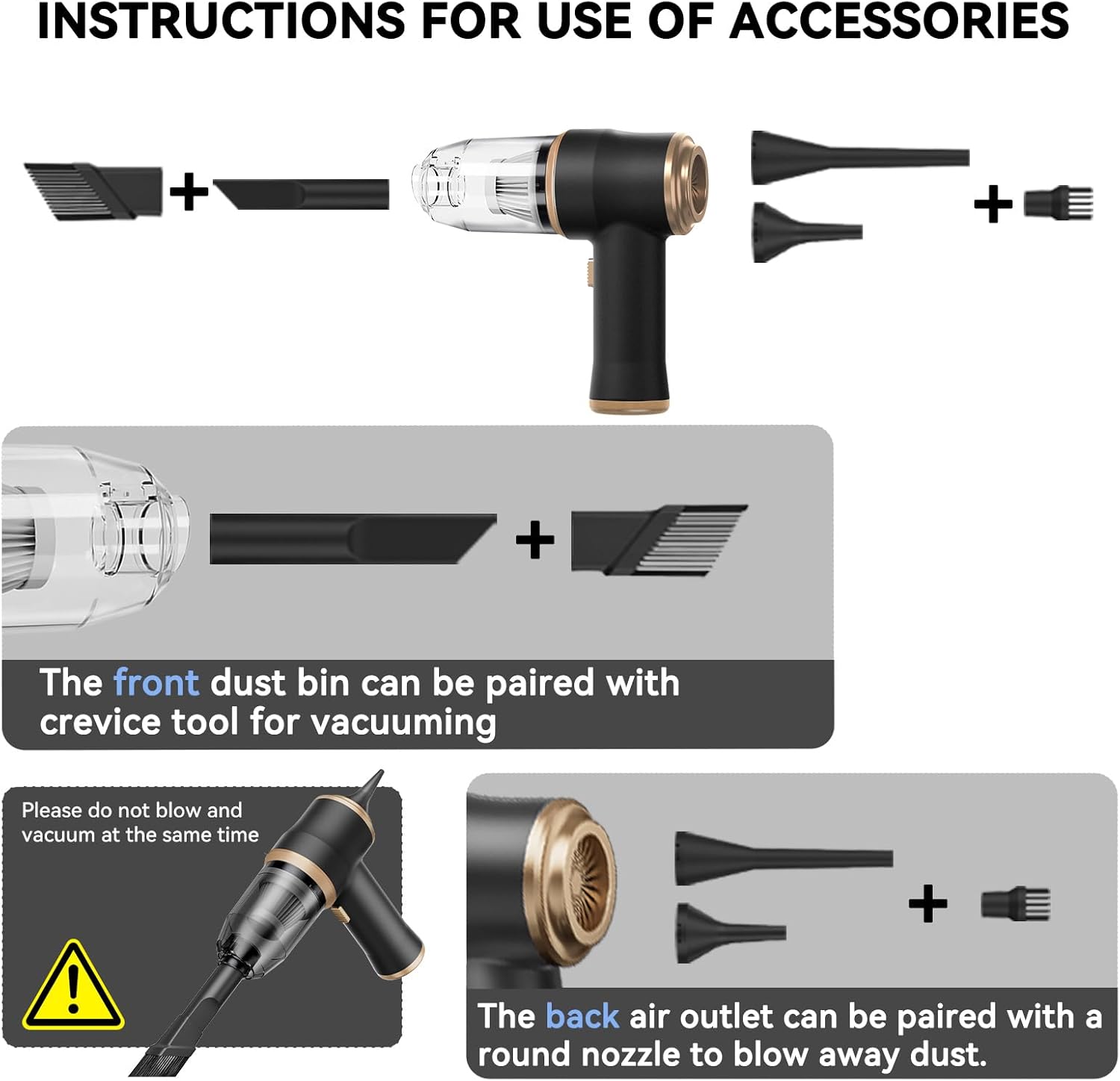 - VACUUM & BLOW: You can easily use it to blow away dirt, debris, dust, and other particles on the surface of objects, as well as suck out tiny stubborn dirt hidden in keyboards, corners, and crevices. Vacuum on the front and blow on the back. Please note that different nozzles correspond to different interfaces on the front and back of the vacuum cleaner