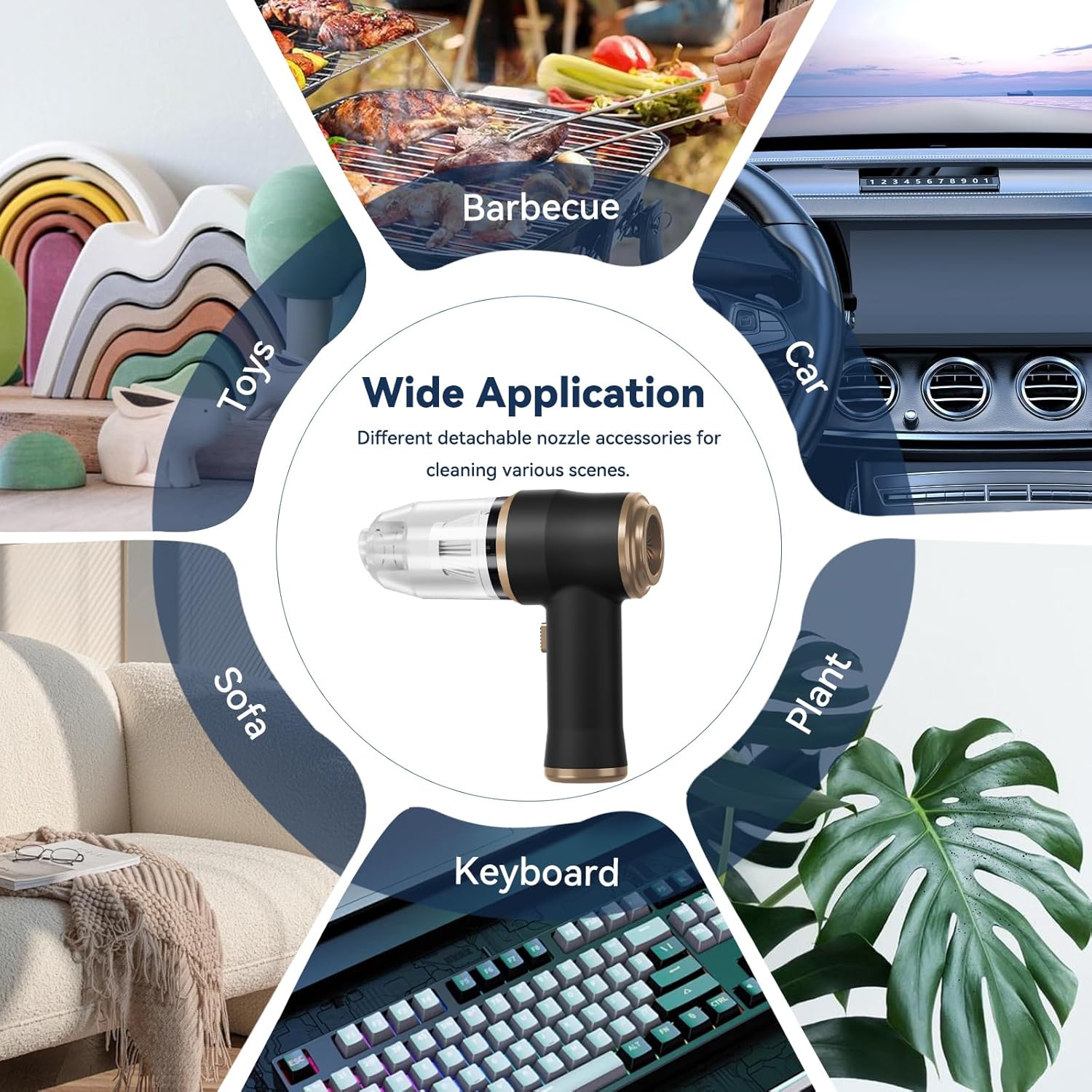 - MULTI-NOZZLES & FINE CLEANING:Crevice Tool access difficult to reach areas such as between sofa cushions and used to vacuum in narrow, irregular crevices in furniture, car interiors, small edges, and more. The portable car vacuum is also equipped with various detachable brush head nozzle accessories, which are very suitable for helping you deeply clean cars, keyboards, cameras, electronics, air conditioning, sofas, windows, pets, plants, etc., or for inflation