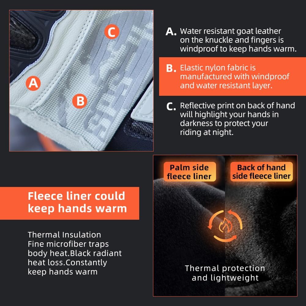 - Carbon fibre on knuckle, lower palm and extended wrist;Stretch zone on fingers ensures wearing comfort and dexterity; Wiper blade on side of forefinger;Leather touchscreen sensitive on both index finger tips and thumb bellies;Super grip print on the finger-reinforced padding and thumb crotch part;
