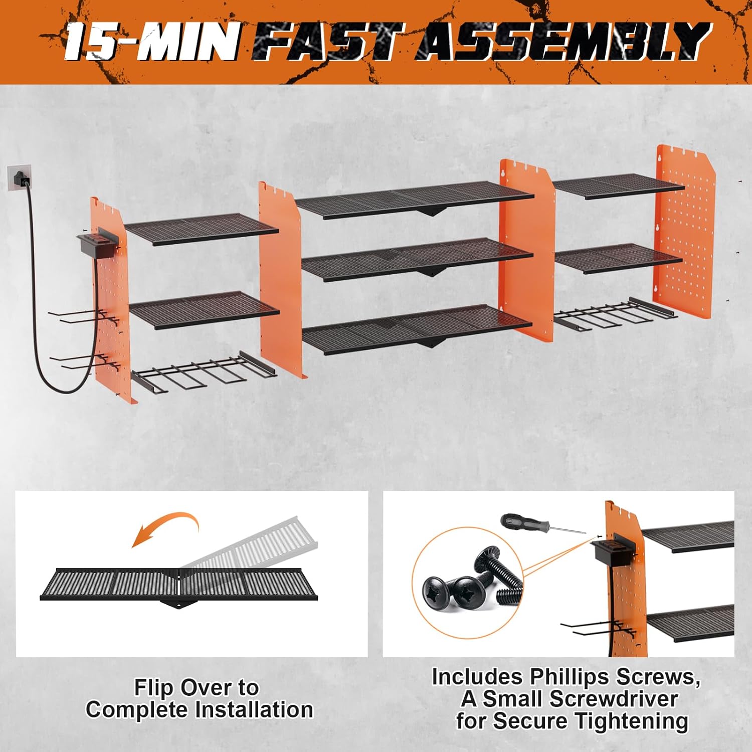 - Power Tool Organizer with Charging Station: Position outlets on either side to keep your tools charged. The American-standard power strip (Output: 125V/12A/1500W) provides device protection, frees up top-shelf space, and clearly displays power status. Includes a 6.56 ft power cord for easy setup