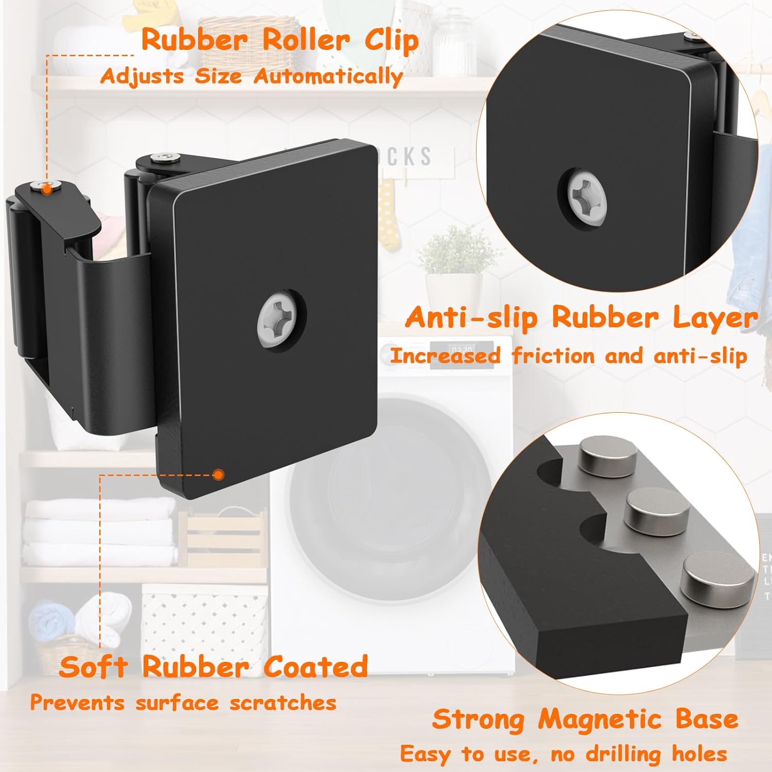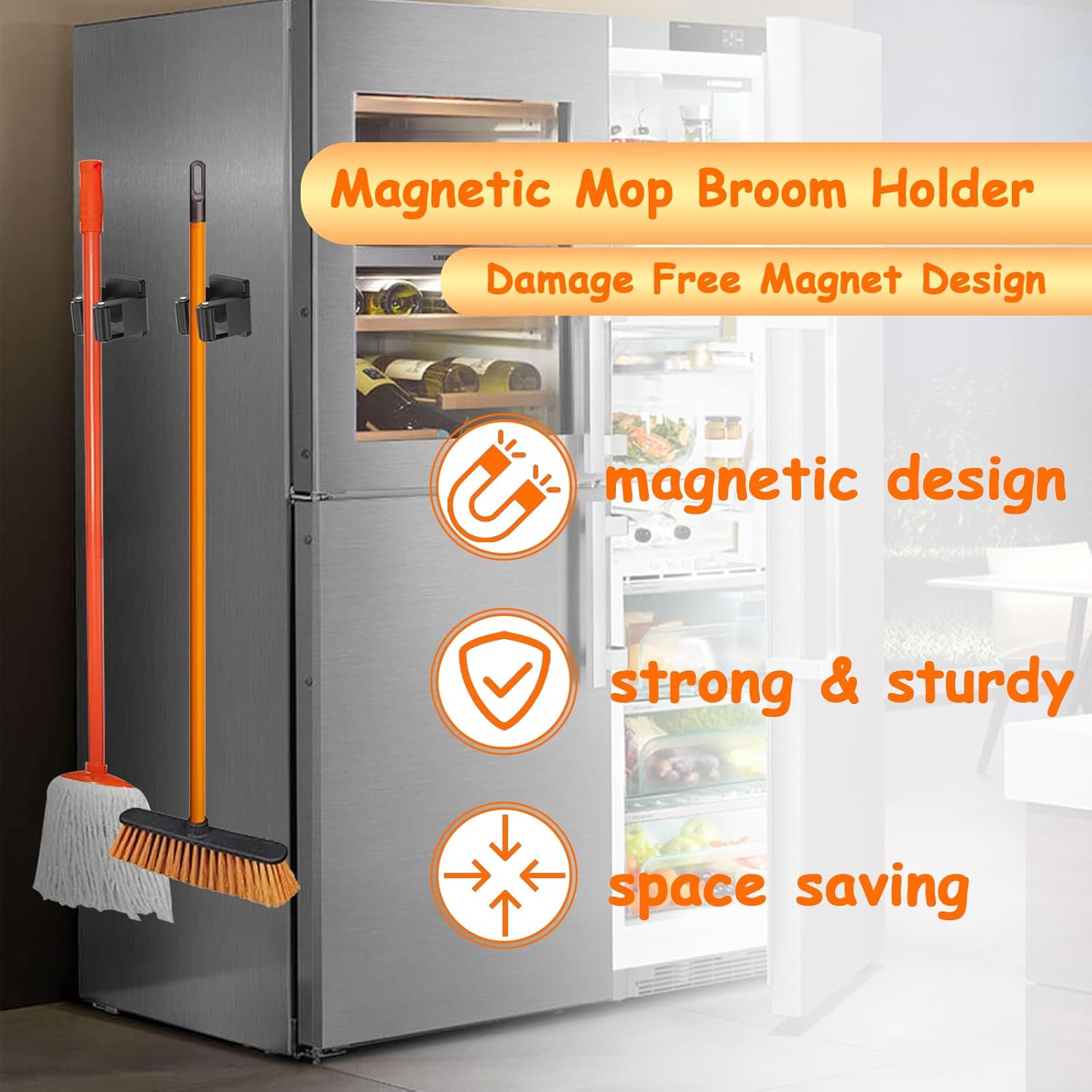 - Versatile Mop Hanger: This magnetic broom and mop holder works on any flat metal surface. It can also be used as a garage organizer, a cabinet organizer for laundry room decor and accessories, and a garden tool storage solution