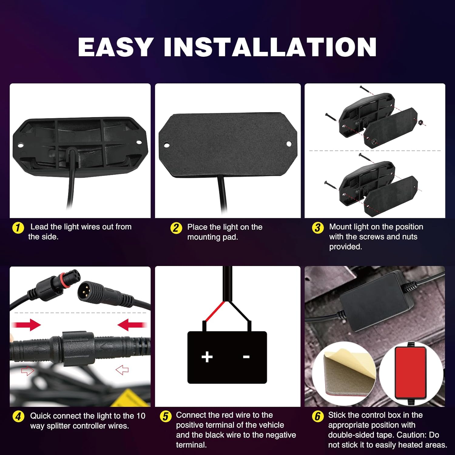 - Quality Materials & Waterproof: Using an aluminum base can effectively and quickly dissipate heat, no longer troubled by heat. Durable and sturdy PC lens is wear-resistant, scratch resistant, and not easily damaged. The combination of PC lens and aluminum base sealing makes the rock light achieve IP67 waterproof, which can also be used in harsh weather conditions