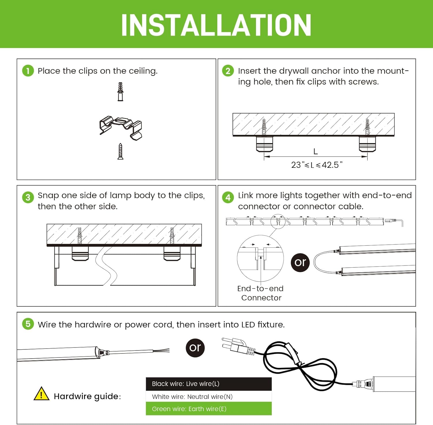 - [Easy Installation]: LED garage lights come with complete mounting accessory kit including screws and mounting clips for firmly securing the light. Equipped with 59/48/71 inch power cord and 20/48 inch connection cable, you can choose to install the lights on the ceiling or wall; We use the upgraded three-wire plug for preventing the risk of electric shock, ensuring your using safety.