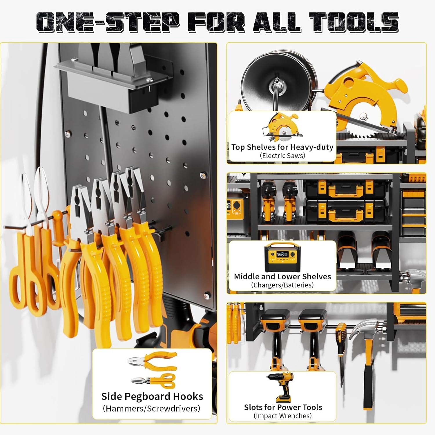 - Versatile Garage Storage Rack: The top shelf holds heavy-duty tools like electric and miter saws, while the middle and lower shelves fit medium-sized items like chargers, batteries, and toolboxes. The 5.4-inch side pegboard hooks keep hammers and screwdrivers organized and accessible. This wall-mounted garage organization saves floor space, transforming a cluttered area into an organized workspace. Note: Tools shown are for display only and are not included