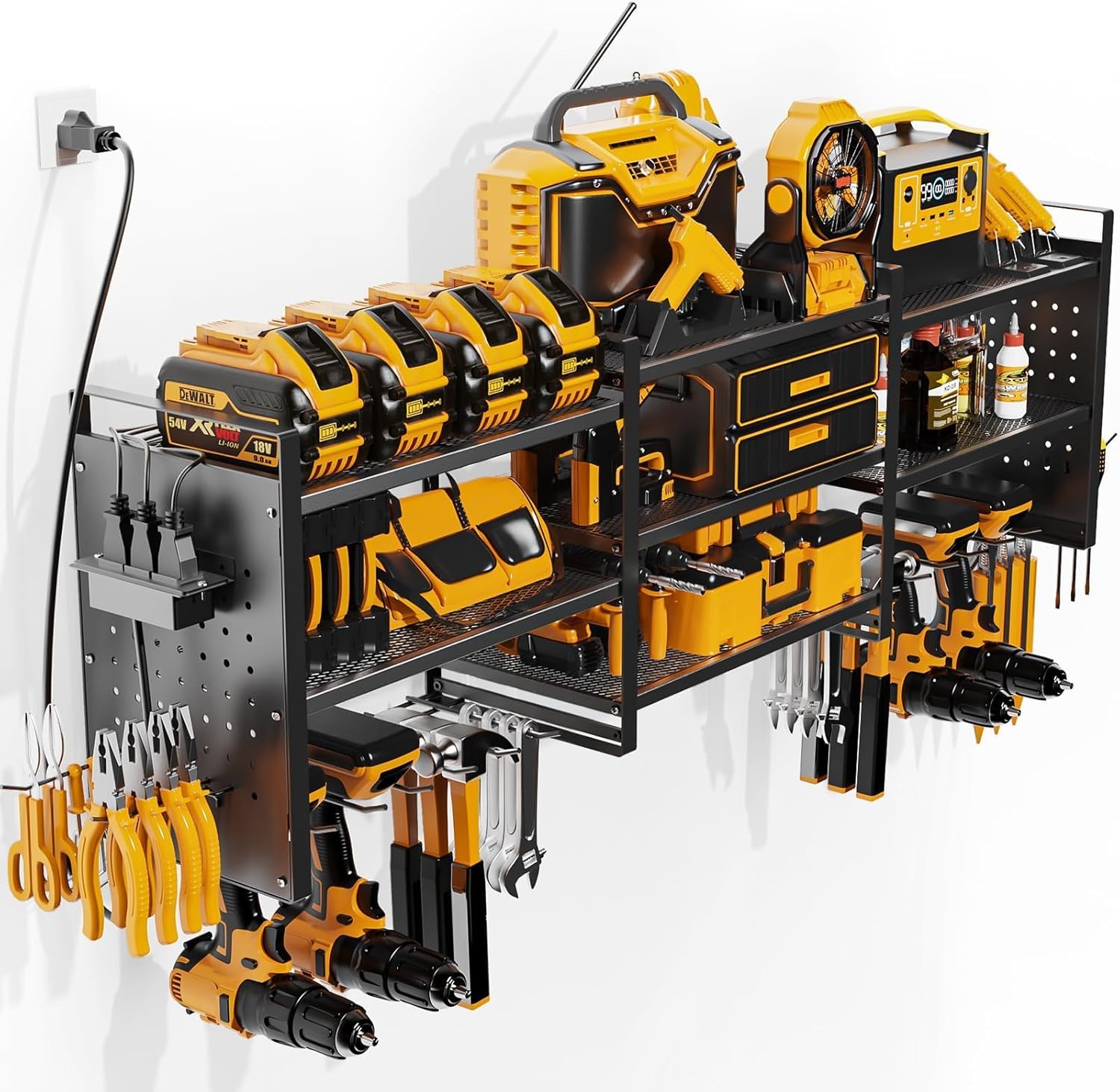 - Power Tool Organizer with Charging Station: Position outlets on either side to keep your tools charged. The American-standard power strip (Output: 125V/12A/1500W) provides device protection, frees up top-shelf space, and clearly displays power status. Includes a 6.56 ft power cord for easy setup