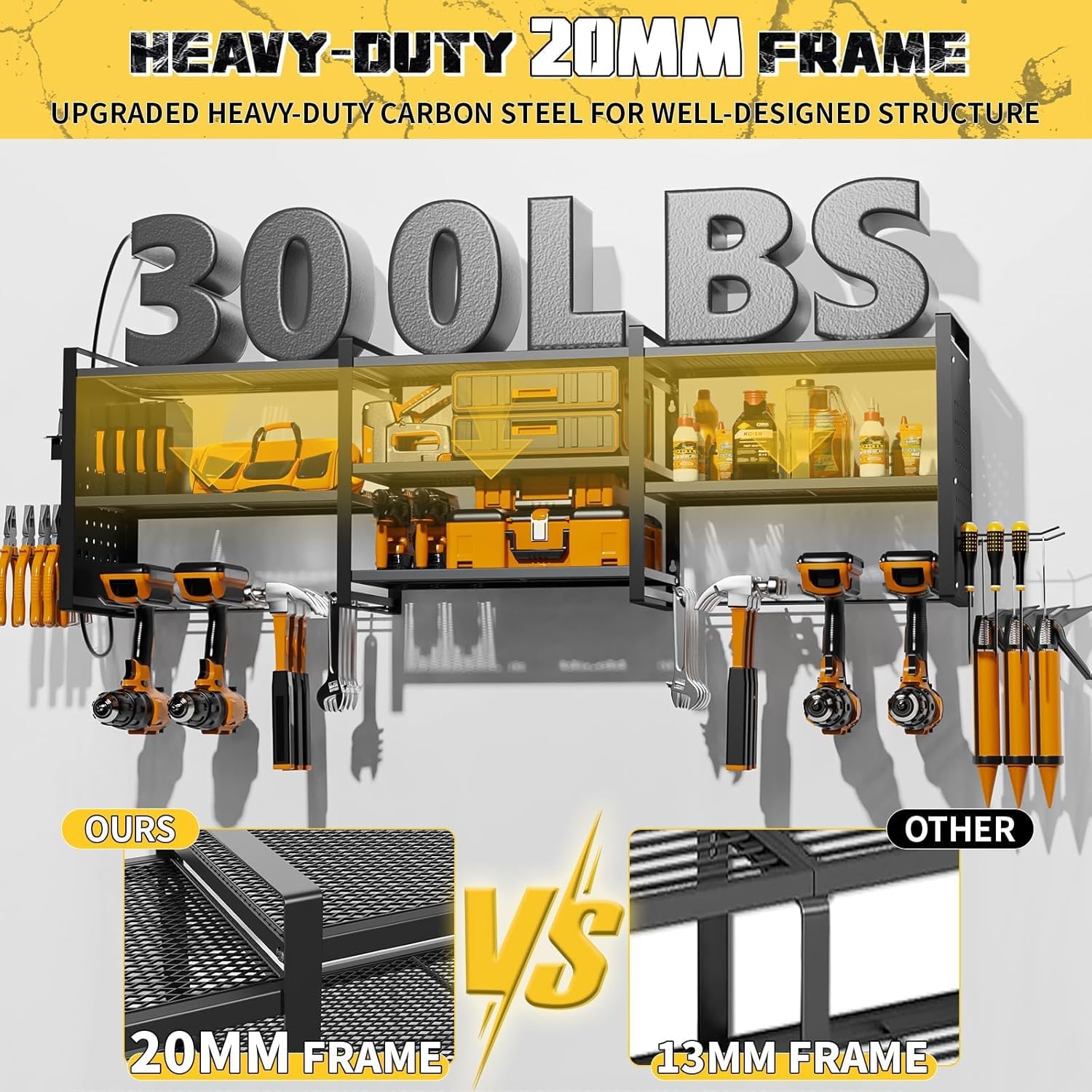 - Stable Structure with High Load Capacity: Made from heavy-duty upgraded carbon steel, this wall-mounted tool organizer is strong, stable, and resistant to deformation, supporting up to 200 lbs (40 lbs per shelf). It features easy assembly with included Phillips screws and screwdriver for a hassle-free installation