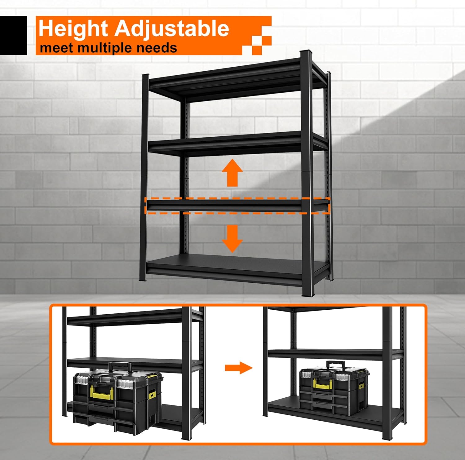- 【DIY Free and Adjustable】Our storage shelves are adjustable by moving the crossbar to meet the different heights of needed. With versatile design, our garage shelving transform your cluttered garage into organized spaces with ease