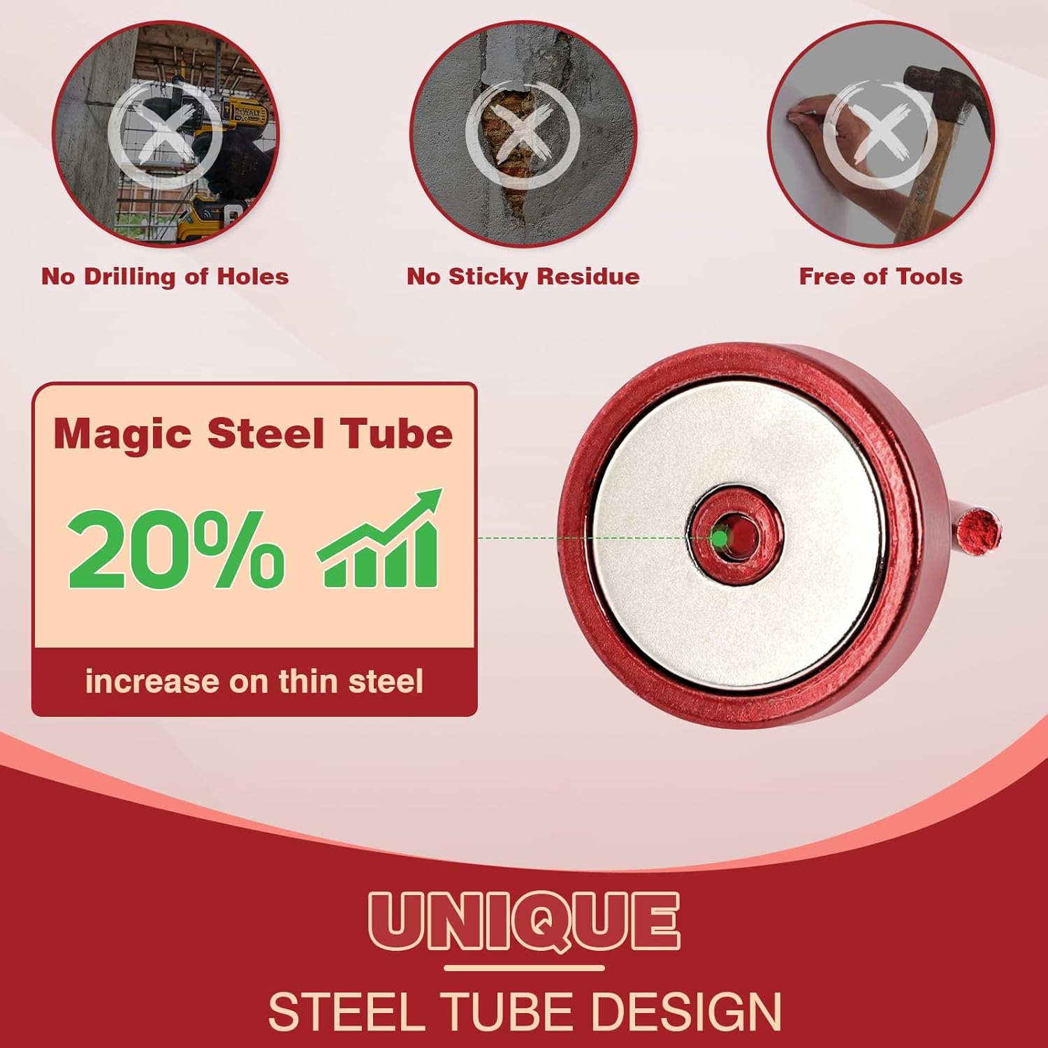 - ✔MAGIC STEEL TUBE DESIGN - Unique design of steel tube inside the base of magnetic hooks greatly increases the attractive force , especially on thin steel! It increase approximately 20% force comparing those none-tube magnets. it solves the problem of weak force on thin steel. Permanent magnetic hook with magic steel tube, strong magnetism lasts forever!