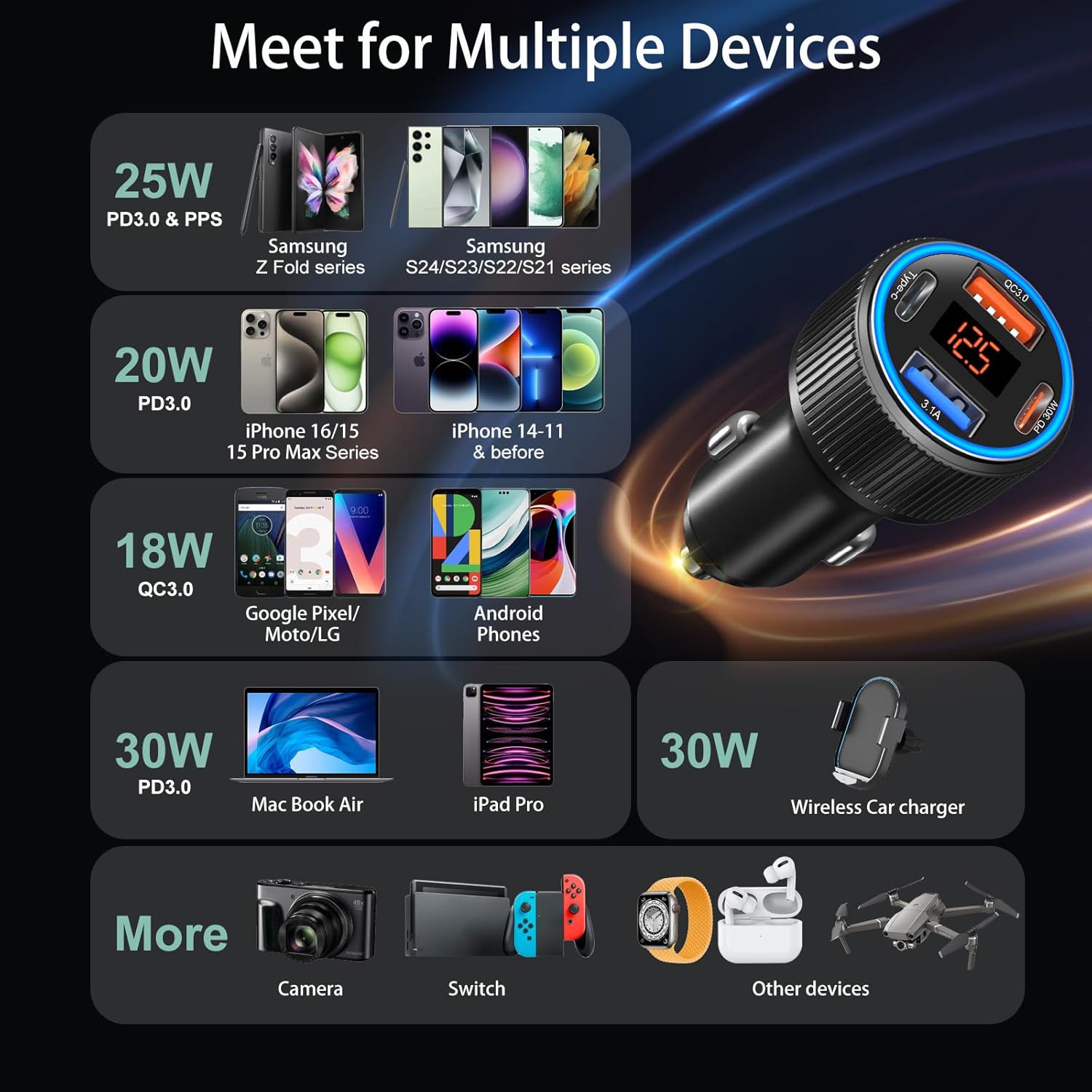 - Special Feature : 4-Fast Port Design, Car Charger with Voltage Display, PD 30W Super Fast Charge, Short Circuit Protection 4-Fast Port Design, Car Charger with Voltage Display, PD 30W Super Fast Charge, Short Circuit Protection