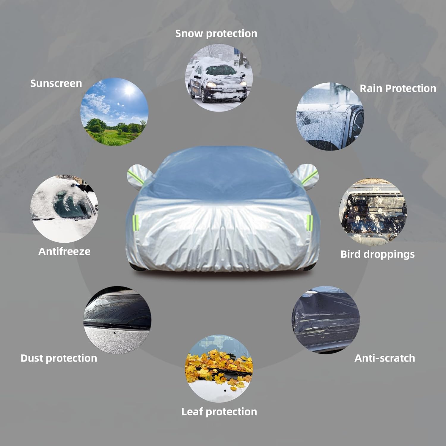 - 【All-Season Protection】 Whether under the scorching sun or in frigid weather, our SUV car cover provides comprehensive protection across all four seasons. It guards against dust, snow, hail, industrial pollutants, bird droppings, leaves, pollen, acid rain, and intense sunlight, preserving your car's exterior in all conditions.