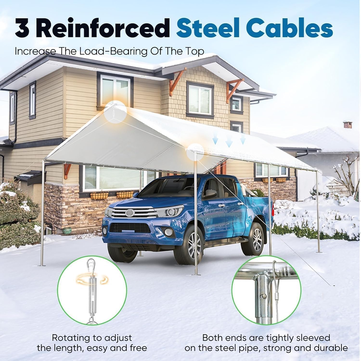 - 【Reinforced Steel Cables】:The car canopy top has extra 3 High strength steel cables to reinforced the entire structure, which makes the whole structure much firm and prevents structural twisting.
