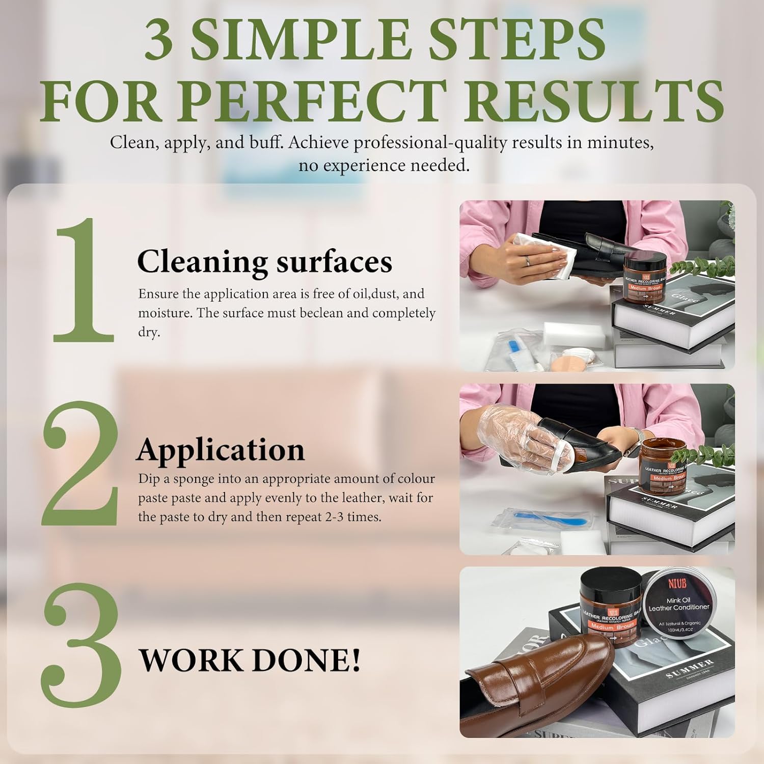 - Easy Application for Instant Results: Designed for convenience, our leather recoloring balm requires no special tools or skills. Simply apply the balm using a soft cloth, and watch as it seamlessly blends into the leather, covering scratches and restoring color. The fast-drying formula ensures your leather items are ready for use in no time.