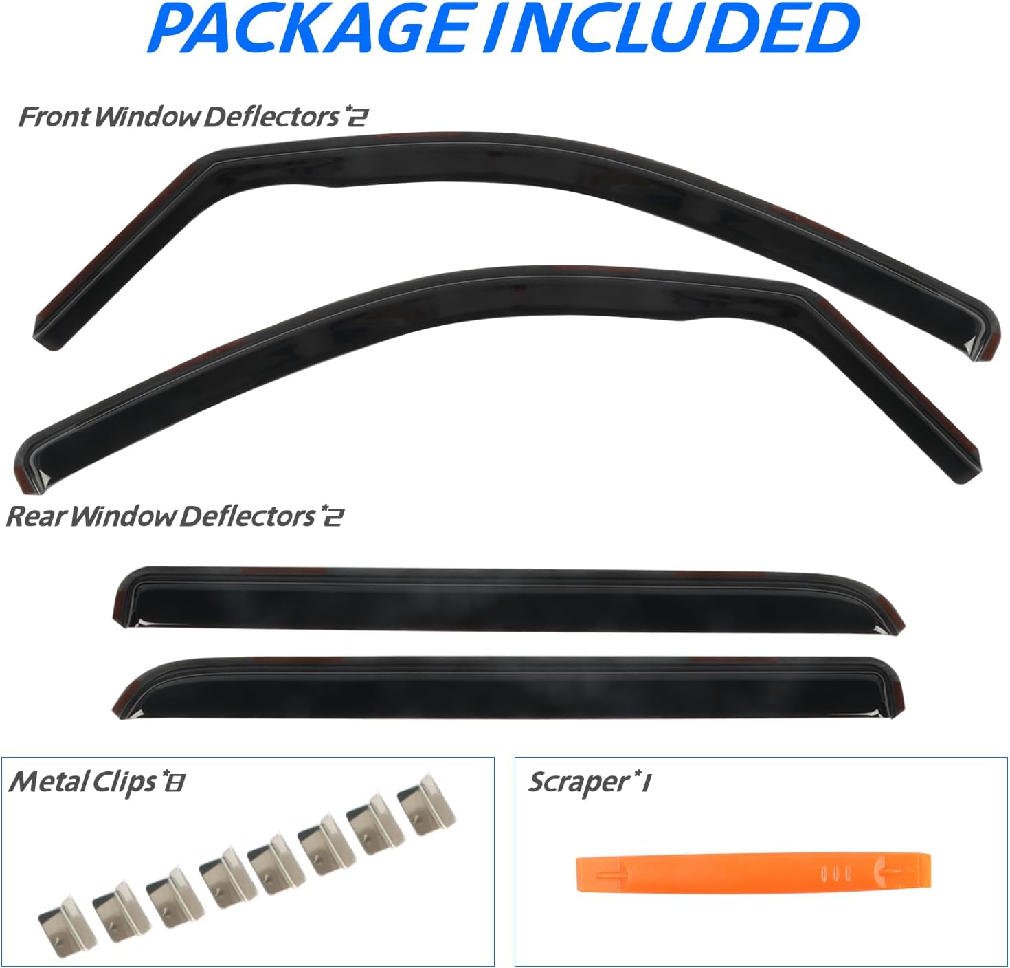 - 【Easy Installation】 Come with 4 pcs FULL-SIZE side window deflectors, 8 pcs clips, 1 pcs plastic Crowbar for a durable and secure installation. No complicated instructions are needed. Attention: Please apply the clip to fix the rain guards