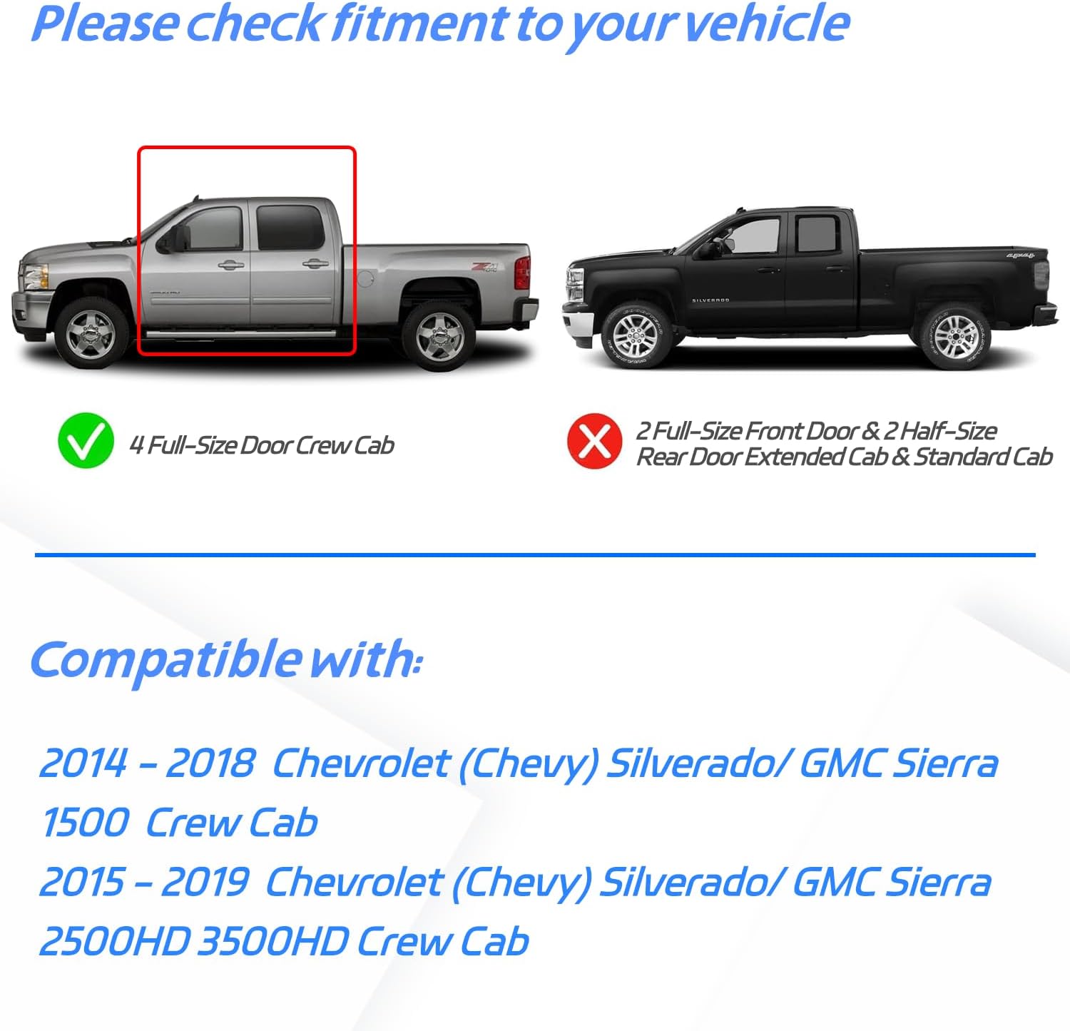- : Vehicle Service Type FIT for 2014 - 2018 Silverado/ GMC Sierra 1500 Crew Cab, 2015 - 2019 Silverado/ GMC Sierra 2500HD-3500HD Crew Cab (4 FULL-SIZE Doors) FIT for 2014 - 2018 Silverado/ GMC Sierra 1500 Crew Cab, 2015 - 2019 Silverado/ GMC Sierra 2… See more
