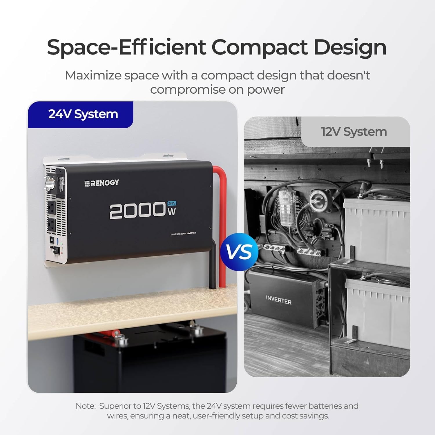 - 【24V system】Small size and light weight inverters have obvious advantages in providing portability, space saving, flexible installation and ease of carrying.