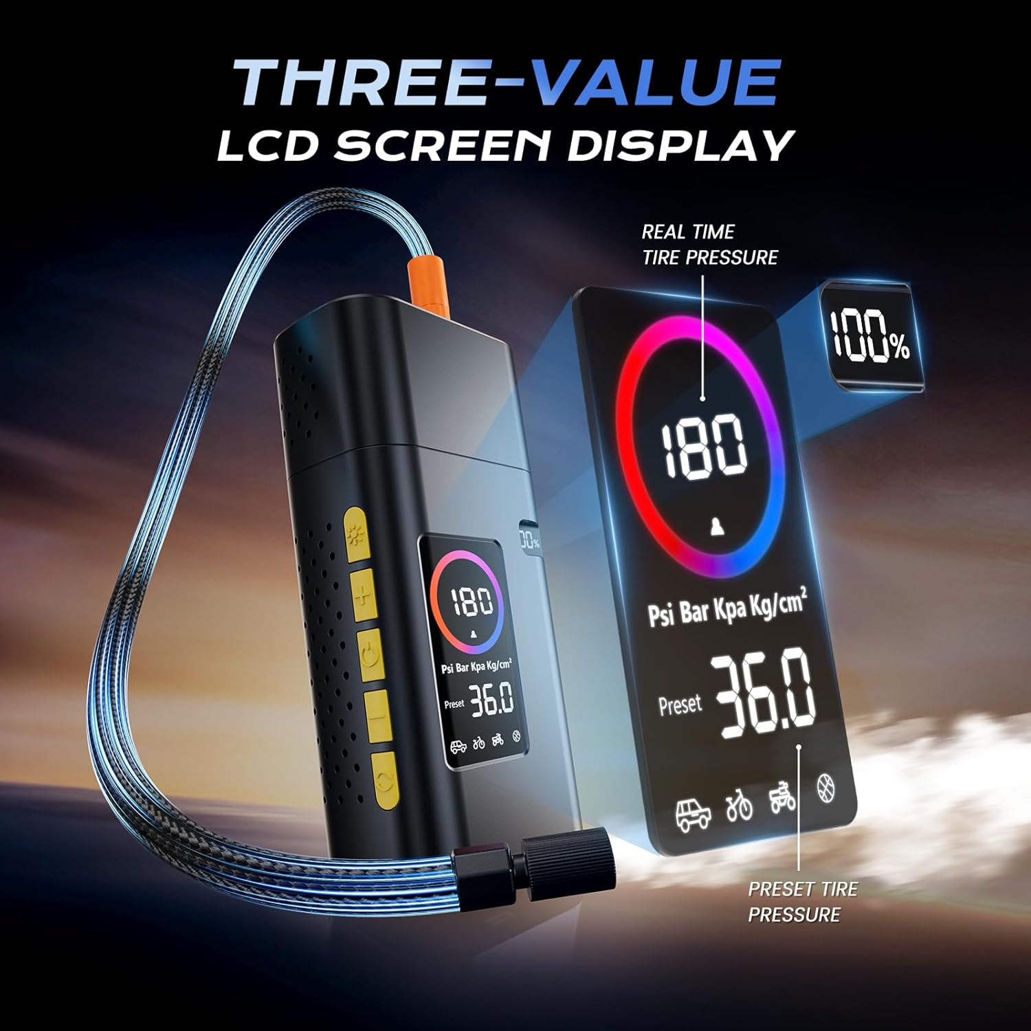 - ➤𝐂𝐥𝐞𝐚𝐫 𝐋𝐂𝐃 𝐒𝐜𝐫𝐞𝐞𝐧: Equipped with a large 3-inch screen, you can catch the air pressure status of the inflation process at a glance. Pressure over 3 can be automatically detected tire pressure, effectively monitor and protect inflated tires, basketballs, swimming rings. And full self-stop, very smart and convenient.
