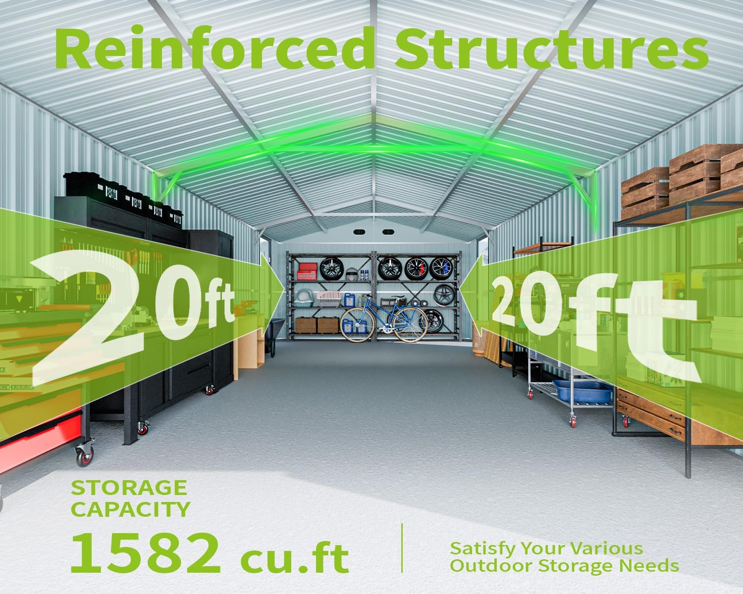 - 🏡 𝐄𝐱𝐩𝐚𝐧𝐬𝐢𝐯𝐞 𝐒𝐭𝐨𝐫𝐚𝐠𝐞 𝐒𝐡𝐞𝐝: Discover our 20x13 ft large metal storage shed, which provides 250 sq. ft. of usable floor space. Ideal for storing vehicles, tools, lawn equipment, and bicycles. This shed offers versatility as it can also be a workshop or a play area for kids, helping you to organize your outdoor space and reduce clutter in your backyard, basement, or garage.
