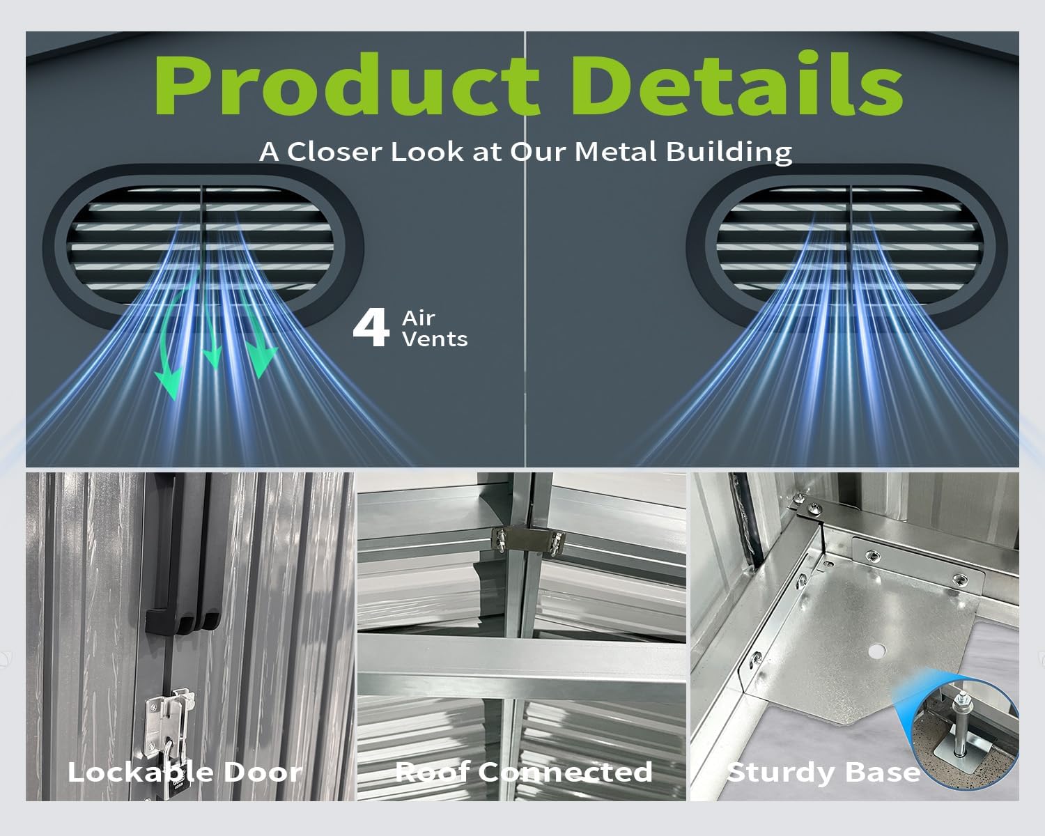 - 🏡 𝐖𝐞𝐚𝐭𝐡𝐞𝐫-𝐑𝐞𝐬𝐢𝐬𝐭𝐚𝐧𝐭 𝐌𝐞𝐭𝐚𝐥 𝐒𝐡𝐞𝐝: This expansive outdoor storage shed is built to be waterproof with a sloped roof that efficiently prevents water leakage or accumulation from intense rain or snow. It has four vents to improve air circulation, preserving the condition of your tools. The shed’s sloping roof and lockable door help to eliminate odors and lessen moisture, and it includes a lock for concealed storage.