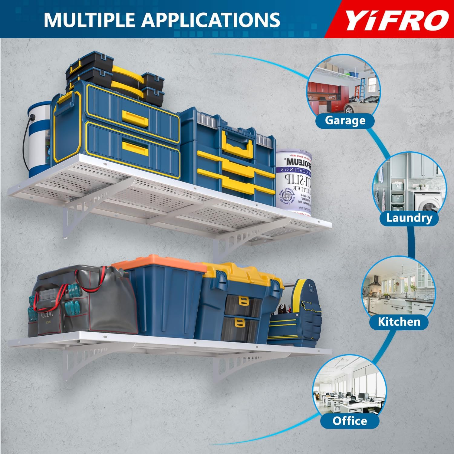- HEAVY DUTY CONSTRUCTION: YIFRO garage wall shelving takes its cues from architectural frame construction, with a 1.5x4 ft individual bracket load capacity of 250 lbs. and a total of 500 lbs. for 2 shelves, which makes it easy to store most of the items in your garage.
