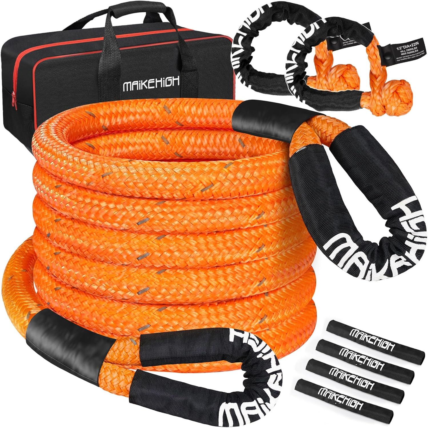 - [Convenient Storage Bag] - This recovery straps offroad kit comes with a high-quality zippered storage bag, made of durable, waterproof PVC material that protects your ropes from moisture and dirt. Large capacity to hold your nylon rope and other off road gear. Easy to carry and keep your car tidy. If you are not satisfied with MAIKEHIGH tow rope, we will send you satisfied solution within 24hours.