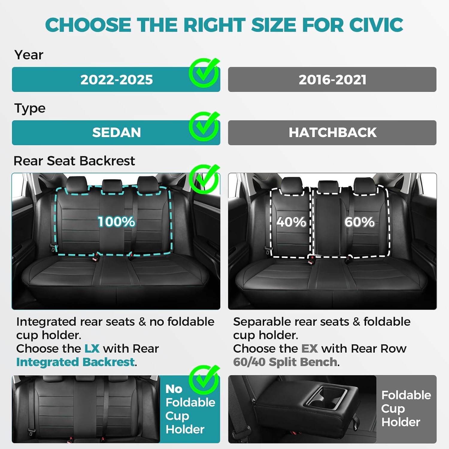 - Tailored for Civic - Designed exclusively for civic, ensuring a perfect fit like a glove.Say goodbye to ill-fitting, sliding universal covers with limited coverage.Please note that these size only fit for the 2022-2025 Civic LX. Ensure that the three seats in the back row are integrated and do not have a foldable cup holder armrest.