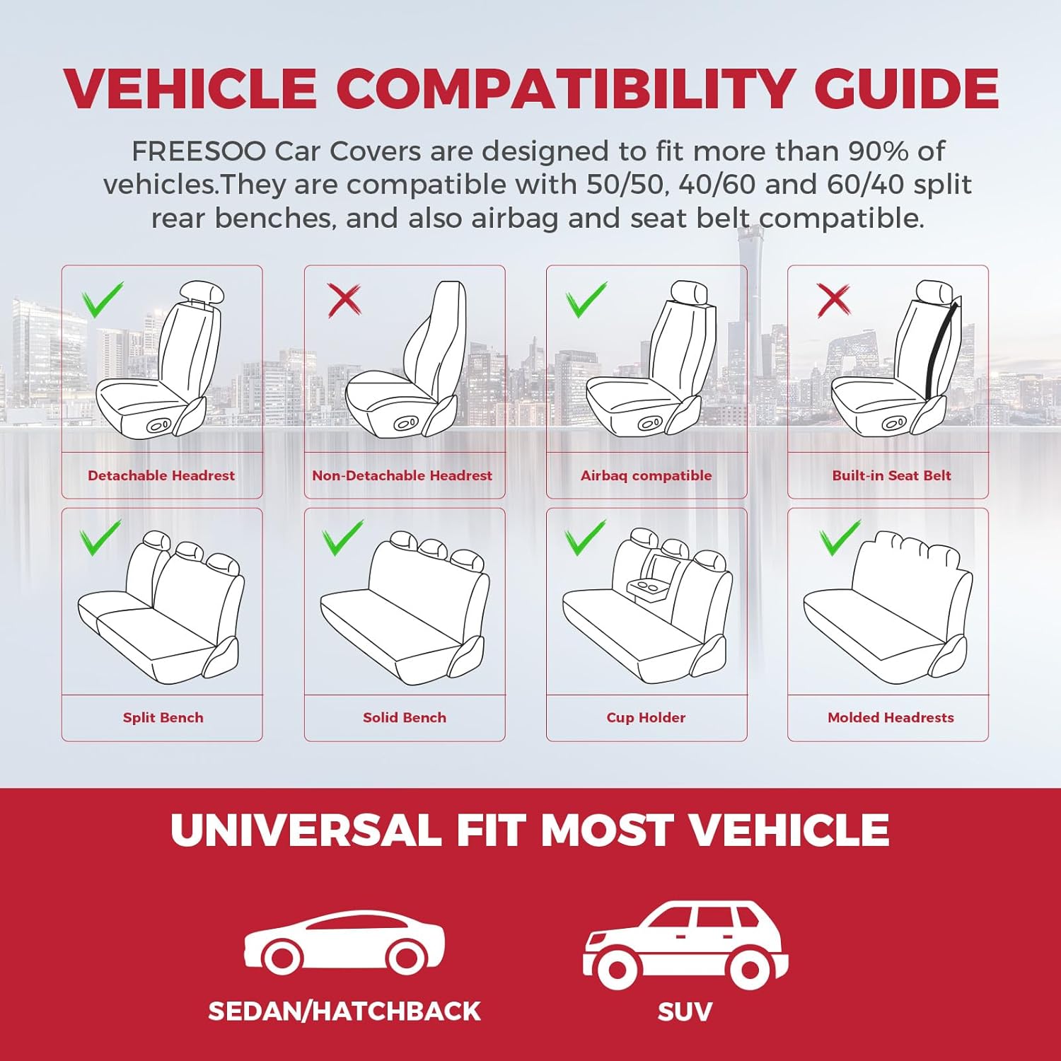 - [Universal Design] The FREESOO car seat covers have been size-verified to fit most sedans and SUVs on the market