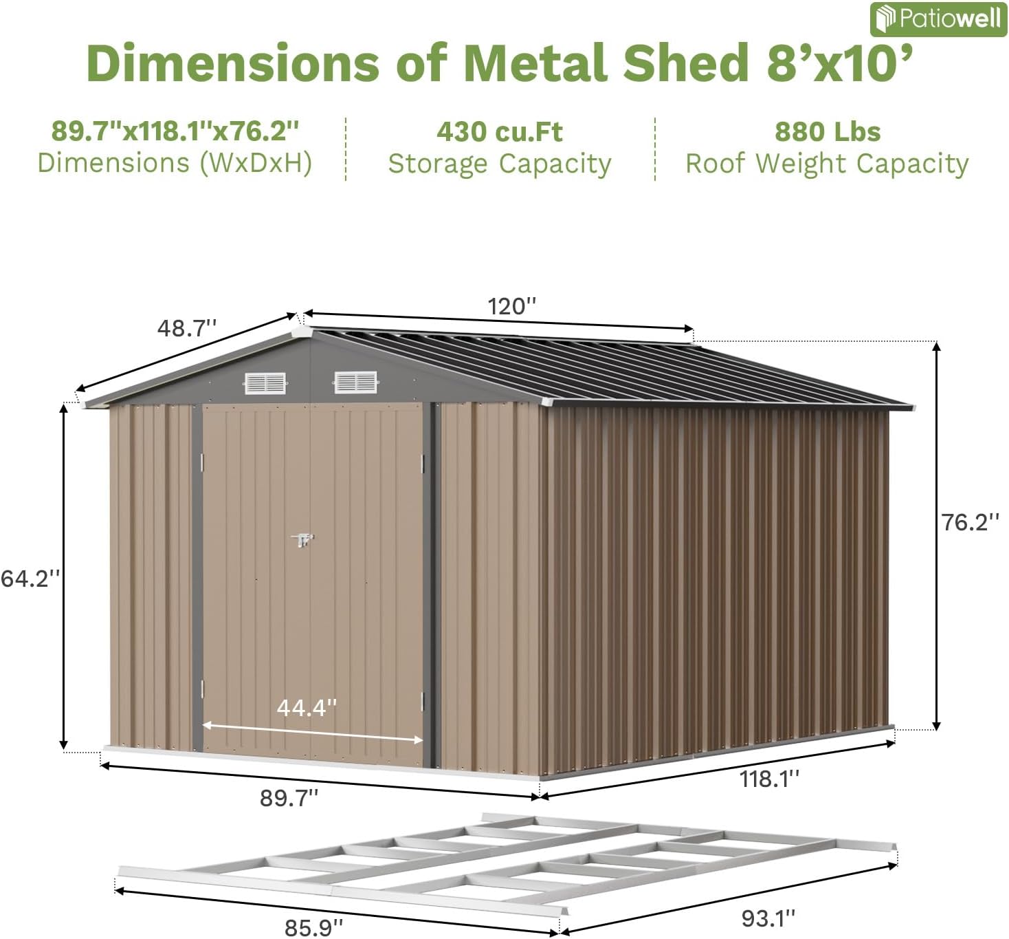 - Spacious Dimensions: Outdoor storage shed has a storage space of 118.1"D x 89.7"W x 76.2"H, you will enjoy a generous 8' x 10' interior, providing ample room to store and organize your tools, equipment, and other belongings with ease.