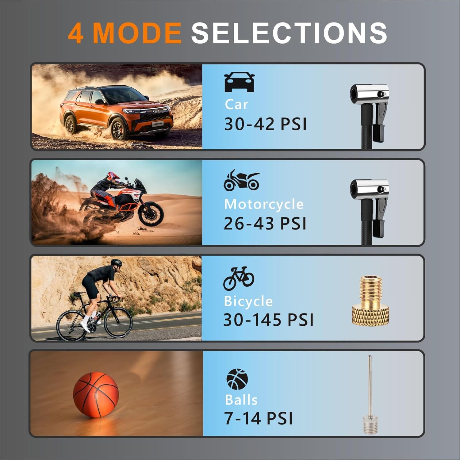 - 【USER-FRIENDLY】- The bike tire pump comes with 4 pressure units (PSI, KPA, BAR, KG/CM²) , 4 preset inflation modes for car, motorcycle, bicycle, and balls. You can easily switch to the inflation mode you need. And if you want to customize the preset pressure value, just preset 3~150 PSI according to the item being inflated to meet your diverse inflation needs.