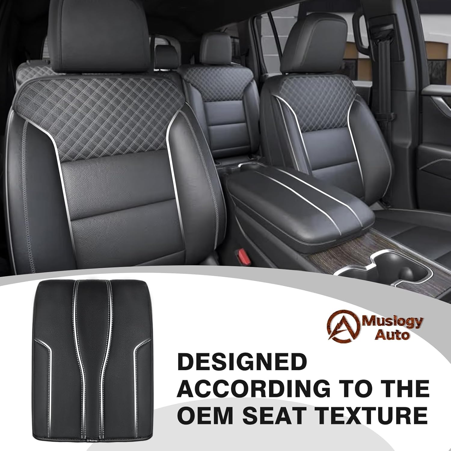Muslogy Armrest Cover Center Console Cover Compatible with 2024 2025 GMC Acadia & Chevrolet Chevy Traverse Accessories Vegan Leather Arm Rest Middle Console Protector (Black/White Stitching)