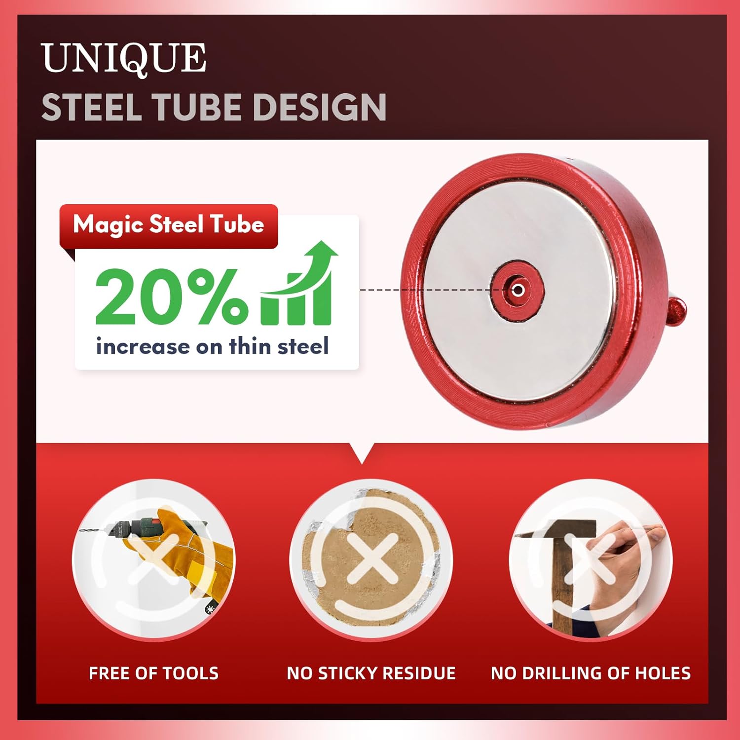 - ✔MAGIC STEEL TUBE DESIGN - Unique design of steel tube inside the base of magnetic hooks greatly increases the attractive force , especially on thin steel! It increase approximately 20% force comparing those none-tube magnets. it solves the problem of weak force on thin steel. Permanent magnetic hook with magic steel tube, strong magnetism lasts forever!