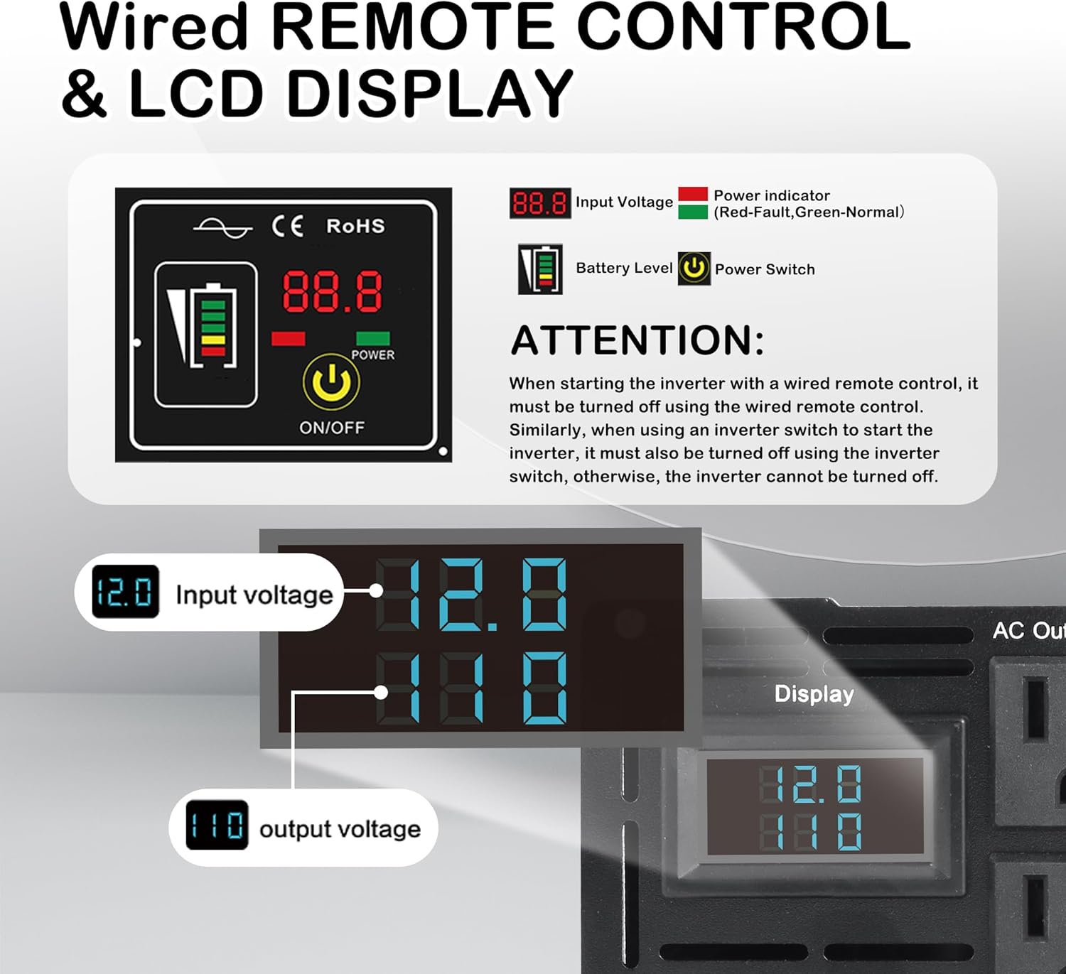 - 【Upgrade Design】The LCD screen of the 1000W power inverter displays the input and output voltages in real-time. When the inverter overheats, the smart fan will turn on to avoid safety issues caused by overheating. A pure sine wave inverter can better protect electrical appliances and avoid damaging them. Equipped with a wired remote control, it is more convenient to operate
