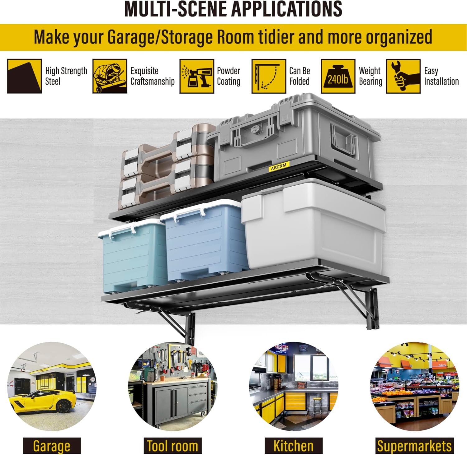 - SUPERIOR DESIGN: The foldable garage storage shelf panel is made of whole steel plate, The surface of matte high temperature powder baking paint, Flat and smooth, Panel with sliding rail design, The bracket can be installed freely in the range of 8"-33" spacing of wood wall keel, And at the same time it adopts folding bracket, Which can be freely stowed away or unfolded