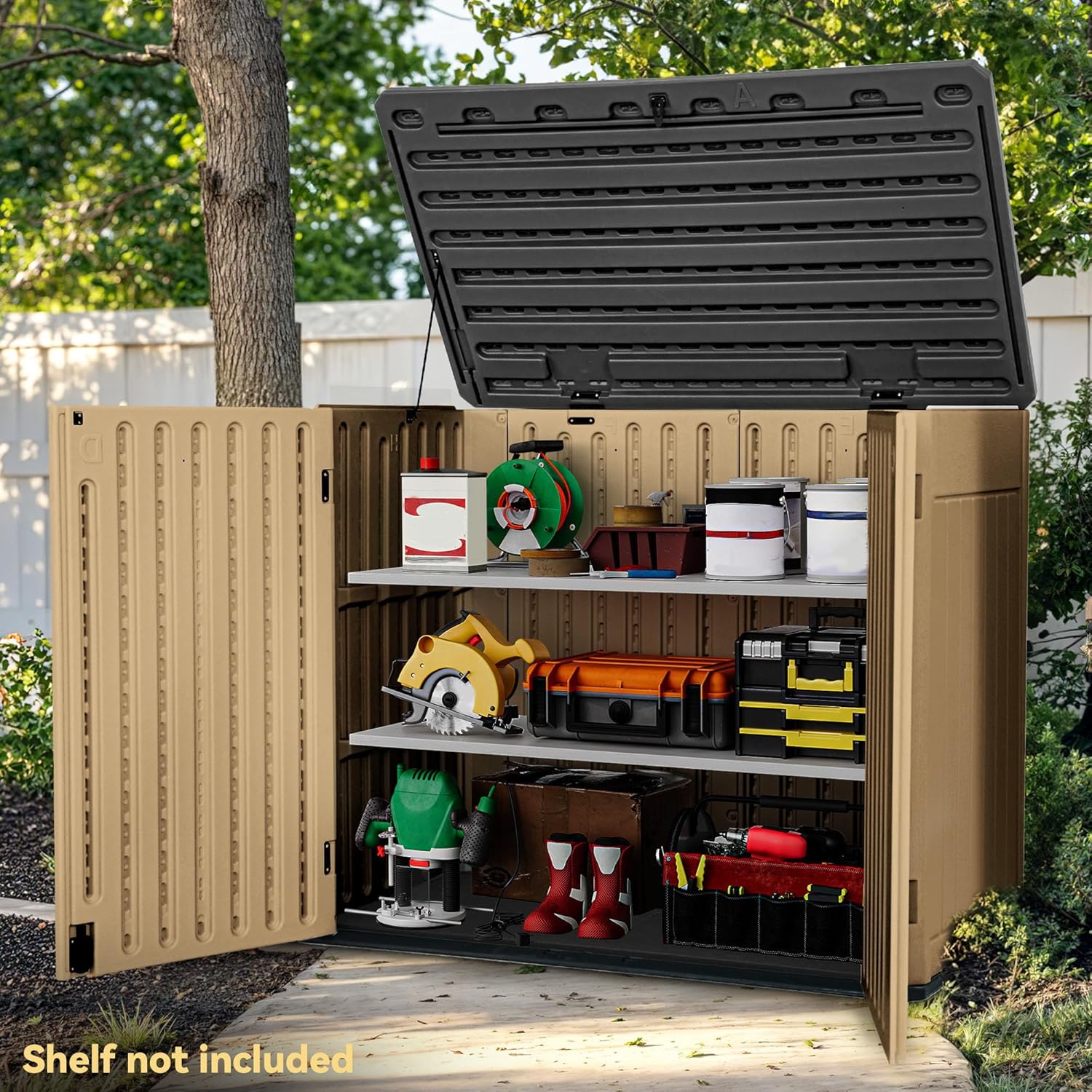 - Spacious Storage Capacity: This plastic storage shelter offers a generous 47 cubic feet of space, suitable for lawnmowers, bicycles, housing gardening implements, garden furnishings, or two trash receptacles; Expand your storage potential by adding an additional laminate shelf (50.5x23.8 inches, not included)
