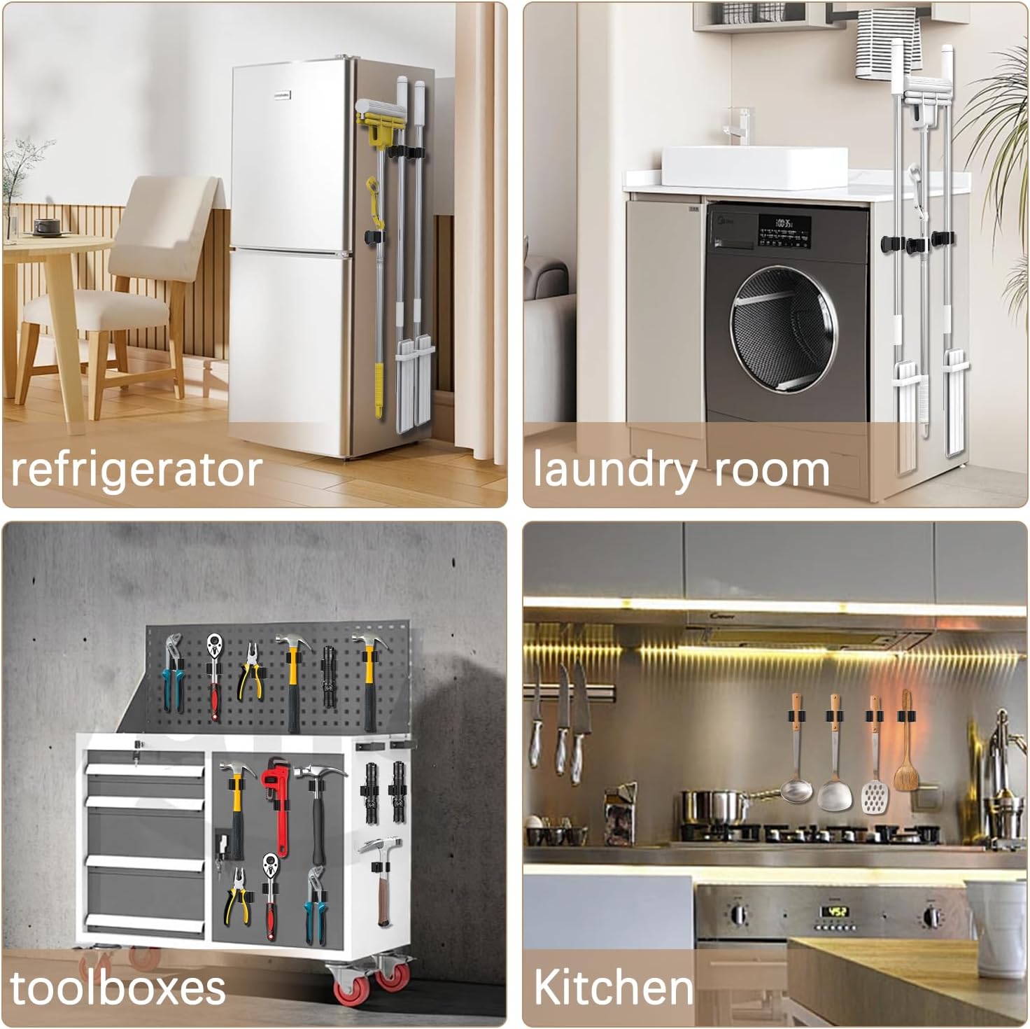 - [Movable Mop Holder Wall Mount Widely Application]: Movable magnetic broom hanger are much handier for hanging brooms, mops, racks, rags, brushes, gloves, baseball bats, and so on. Suitable for kitchen, bathroom, garage, laundry, broom closet, and washing storage