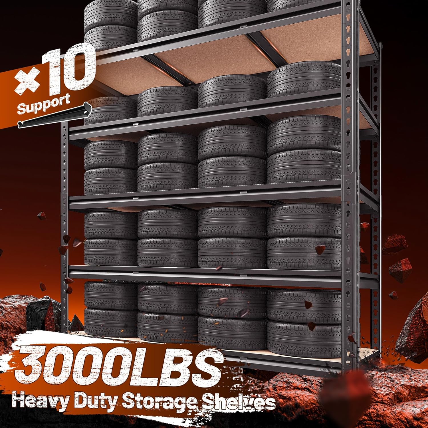- 【3000LBS Capacity Heavy Duty Garage Shelving with 10 Big Ribs Beneath】REIBII Garage storage shelves adopts rolled edge thickened columns, each metal shelving with 10 big reinforcing ribs. Each layer can withstand a weight of 600 pounds, with a total bearing capacity of 3000 pounds. Such strong load-bearing capacity and high-quality metal materials makes 5-tier garage shelving unit more stable, solid and more stuff can be stored