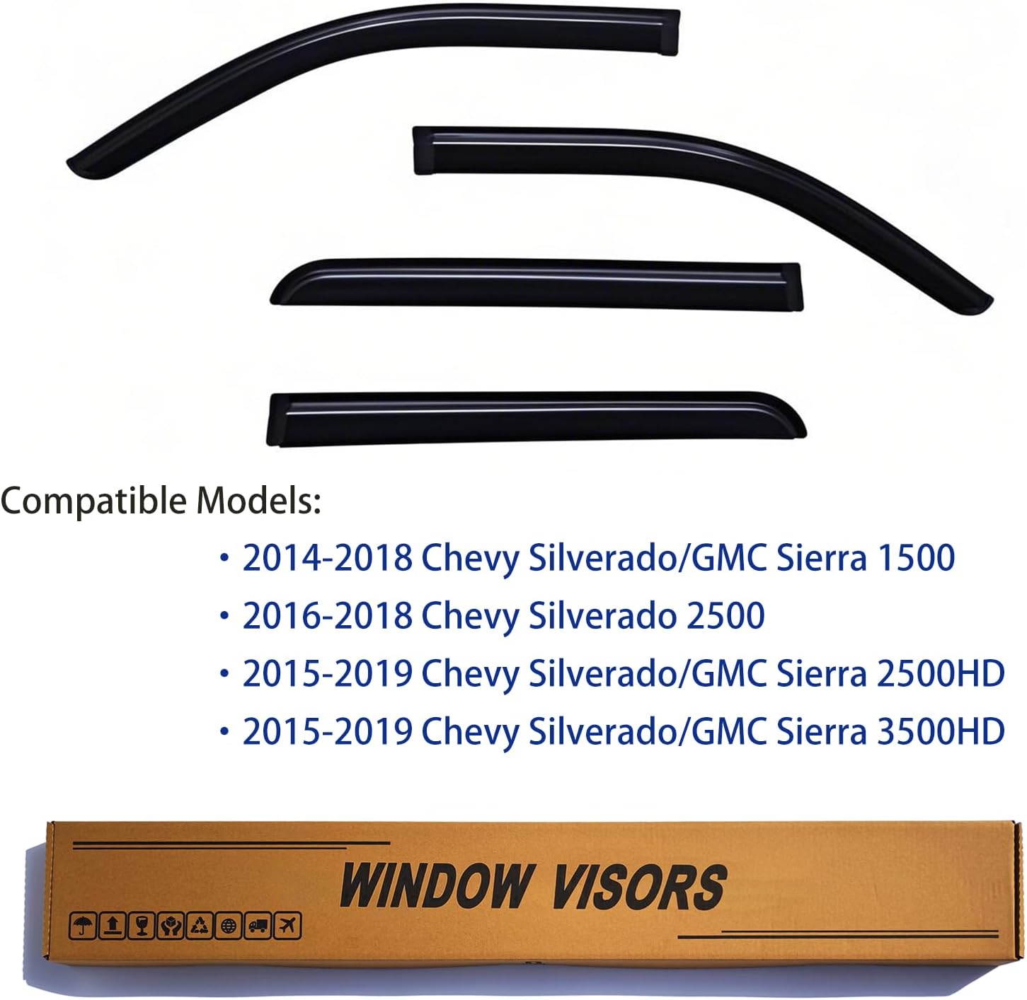 - 【Fitment】-YLSCOO Window Visors Compatible with 2014 2015 2016 2017 2018 Silverado 1500 & GMC Sierra 1500, 2015 2016 2017 2018 2019 Silverado / GMC Sierra 2500 HD / 3500 HD Crew Cab. Note: Please check the display picture to see the cab difference and make sure your truck is the correct cab that this item will fit