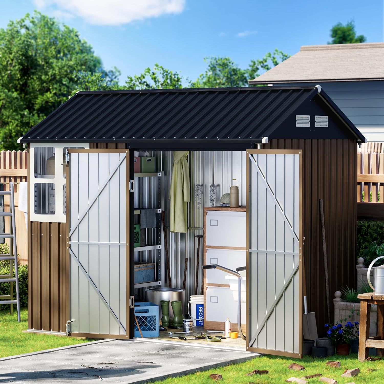 8X6FT Outdoor Steel Storage Shed with Lockable Doors, One Window,Ideal for Garden, Backyard, Patio Storage,Brown