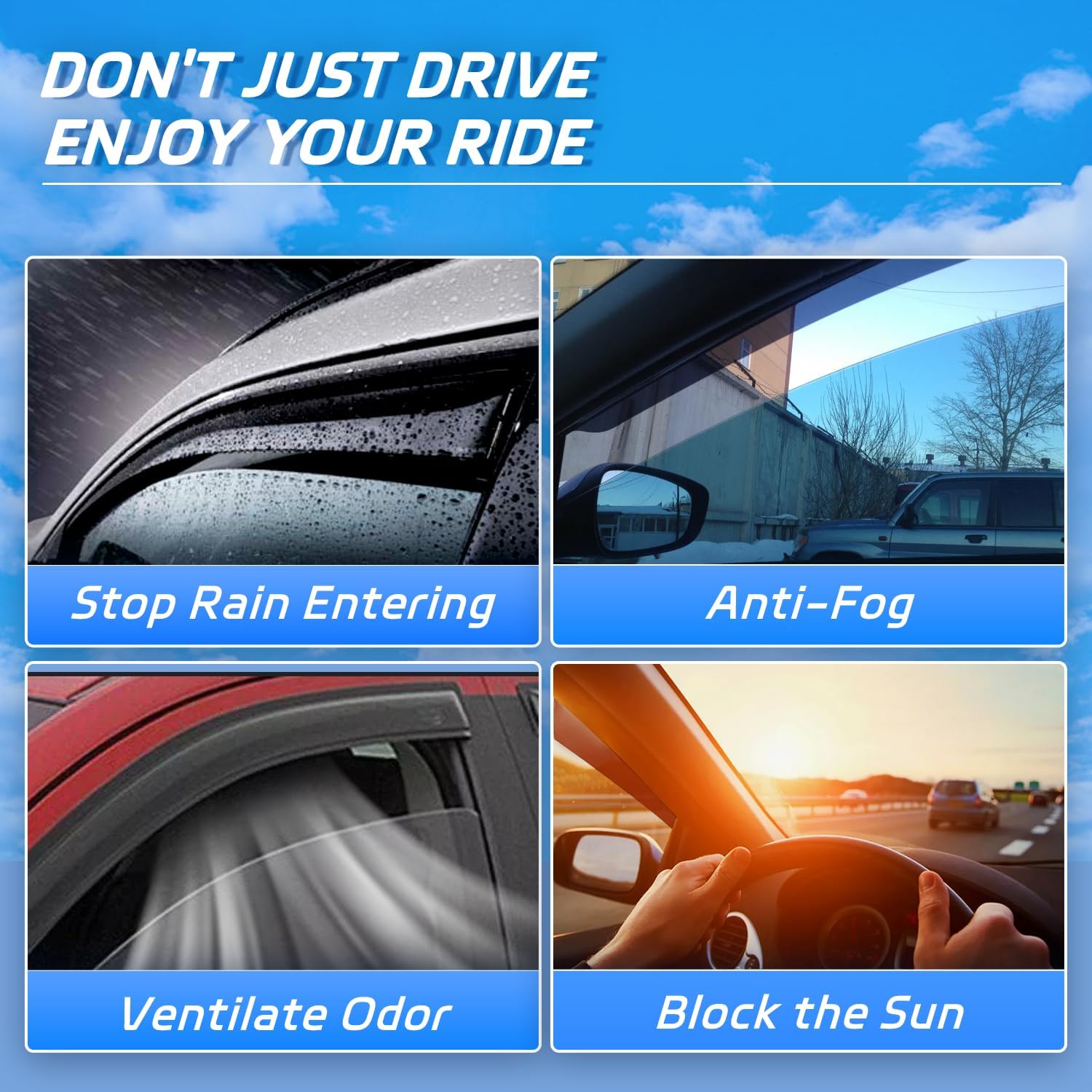 - Improve Driving Experience: Allows fresh air to circulate through open windows while keeping the rain out or reduces heat. Reduce mirror and window fogging; reduce sun glare through side window; reduce wind noise