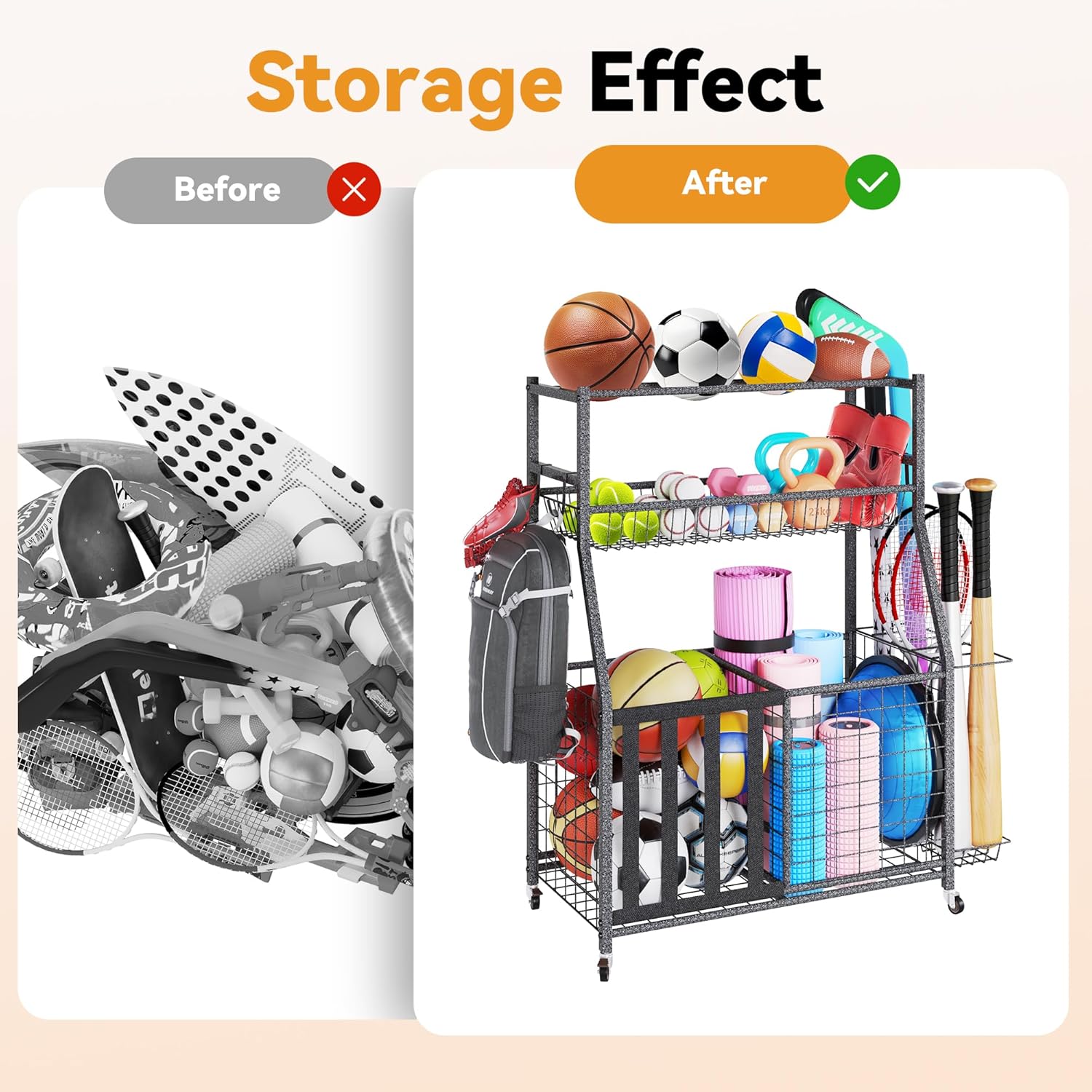 - 【𝐌𝐮𝐥𝐭𝐢𝐩𝐥𝐞 𝐎𝐜𝐜𝐚𝐬𝐢𝐨𝐧𝐬 𝐟𝐨𝐫 𝐔𝐬𝐞】This sports multifunctional storage organizer is perfect for placing in your garage, basement, storage room, room, bedroom, gym, school, and any workplace in your home. Not only can it hold children's basketballs, soccer balls, rackets, toy guns, but it can also hold helmets, backpacks, skateboards, shoes, and more. It can help you improve space utilization, make your home space tidy and orderly, and also facilitate your retrieval of items at any time