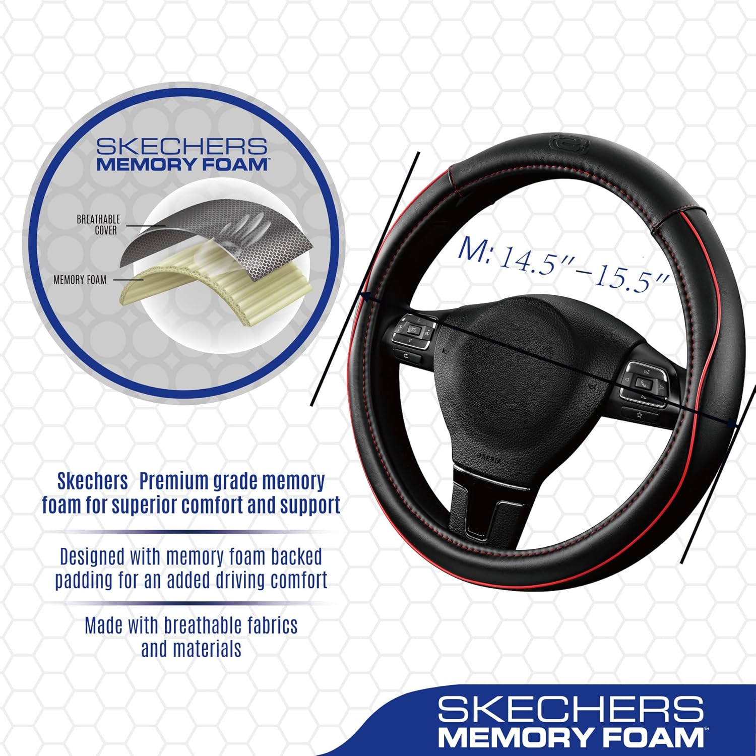 - SKECHERS MEMORY FOAM(TM)-Skechers Memory Foam(TM) steering wheel cover made from the same slow-rebound material as Skechers athletic shoes, high-quality leather that promotes airflow and reduces heat buildup, ensuring a comfortable and refreshing ride even on hot days.