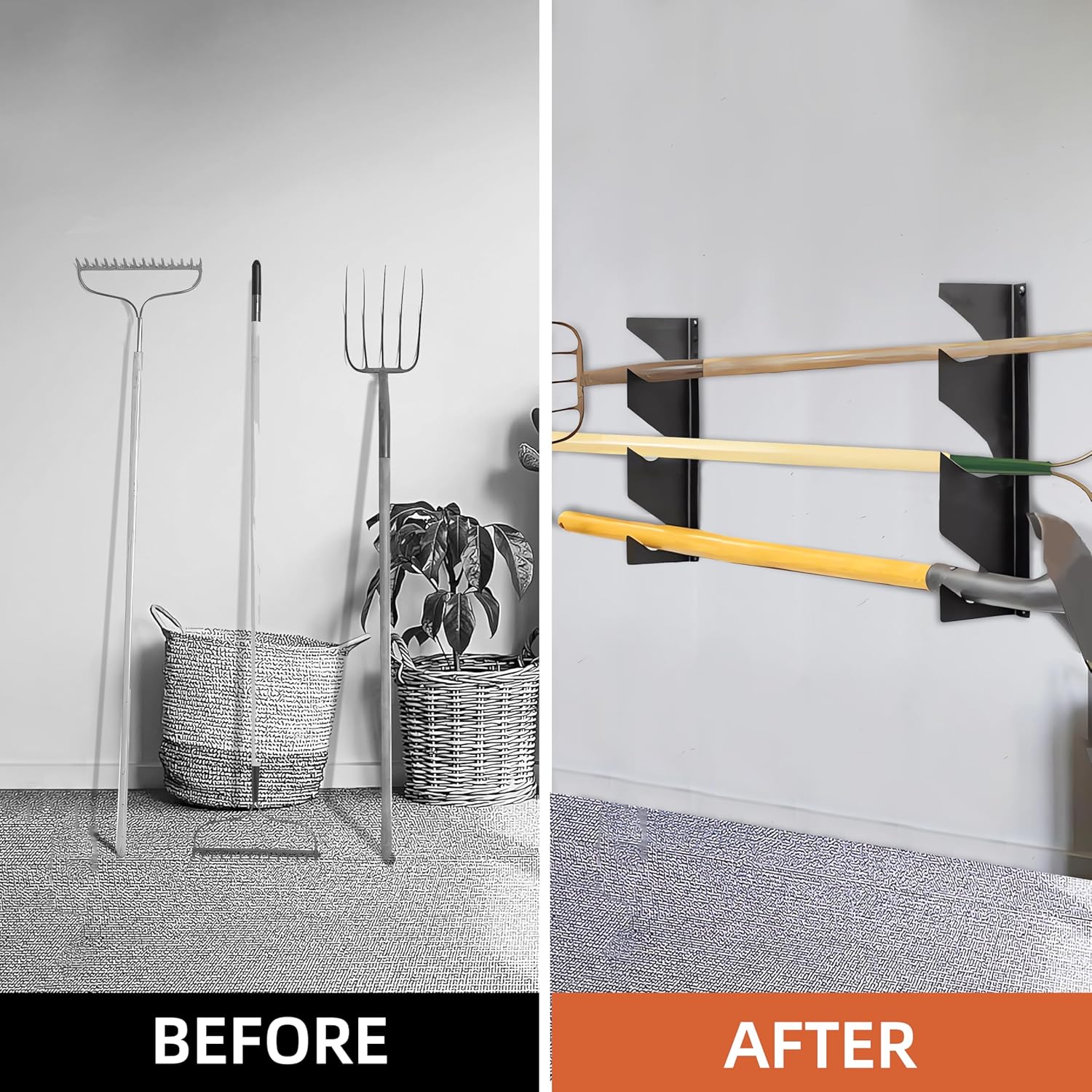 • Maximize Space with the Garage Tool Organizer Wall Mount:Transform your cluttered garage or shed into an organized space with this Garden Tool Organizer. Measuring 17.5" L x 4" W x 1" H, it securely holds shovels, rakes, brooms, and other long-handled tools, keeping them off the ground and easily accessible. Perfect for garages, workshops, and utility rooms