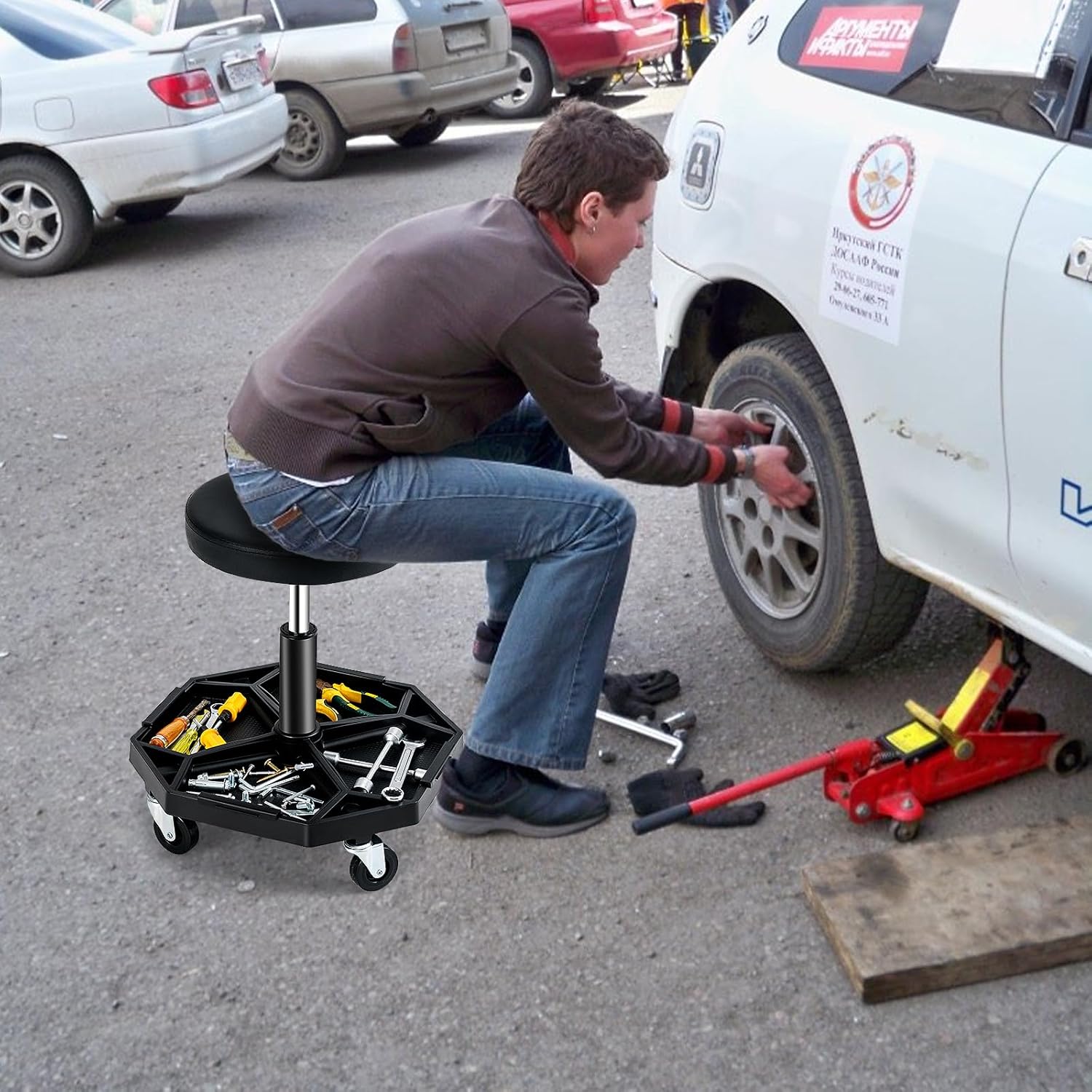 Adjustable Mechanic Rolling Stool, Pneumatic Rolling Stool with Wheels, Tool Storage Tray & Padded Seat Cushion, Garage Stool Chairs Creeper Seat (Black)