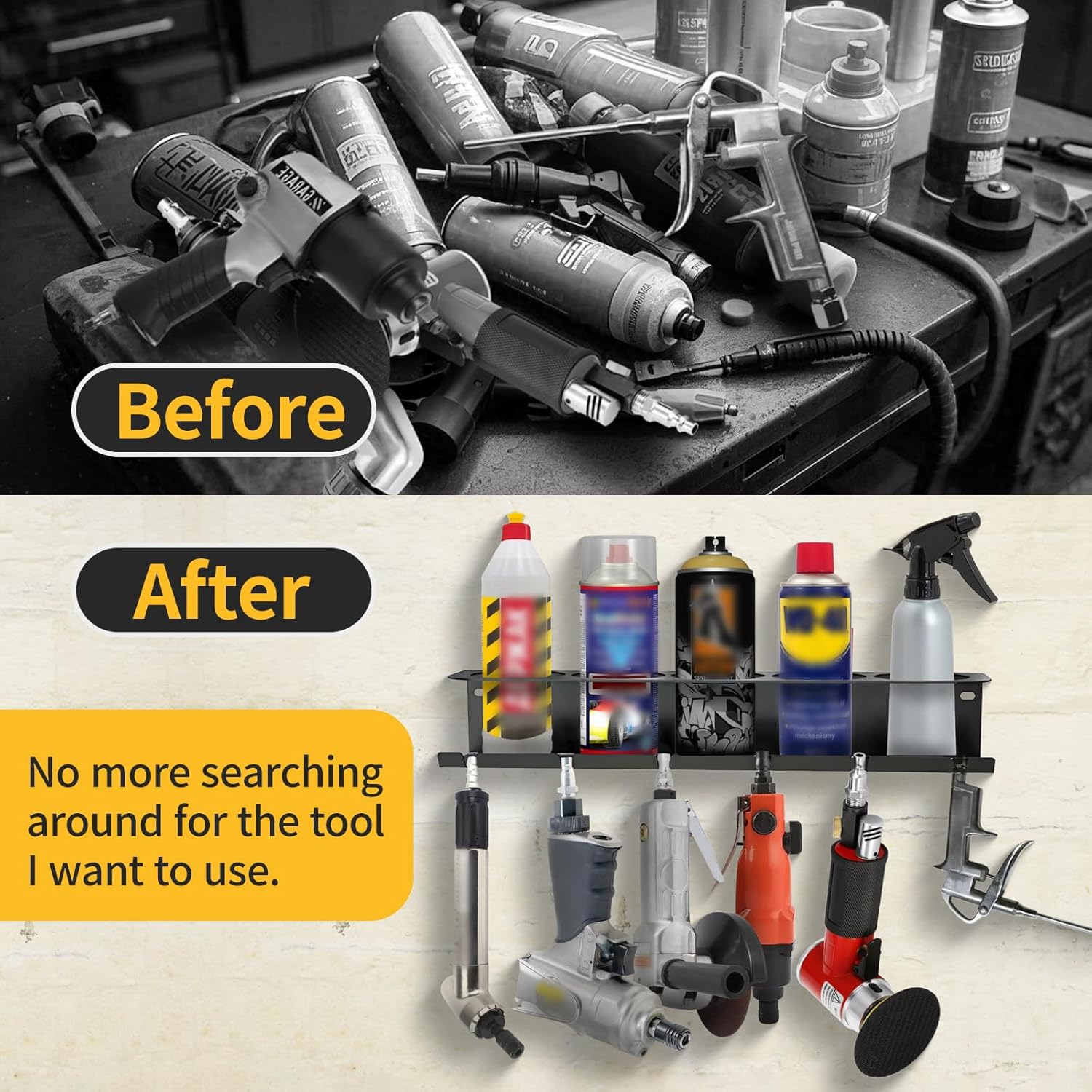 - 2 in 1 Aerosol Spray Can Storage Rack: Each spray can holder rack with 5 can bottle storage hole and 6 slots air tool holder, multipurpose organizer designed to provide maximum convenience and storage space, ideal for storing spray paint cans, cleaner bottles or air tool holders to keep your workspace organised and tidy