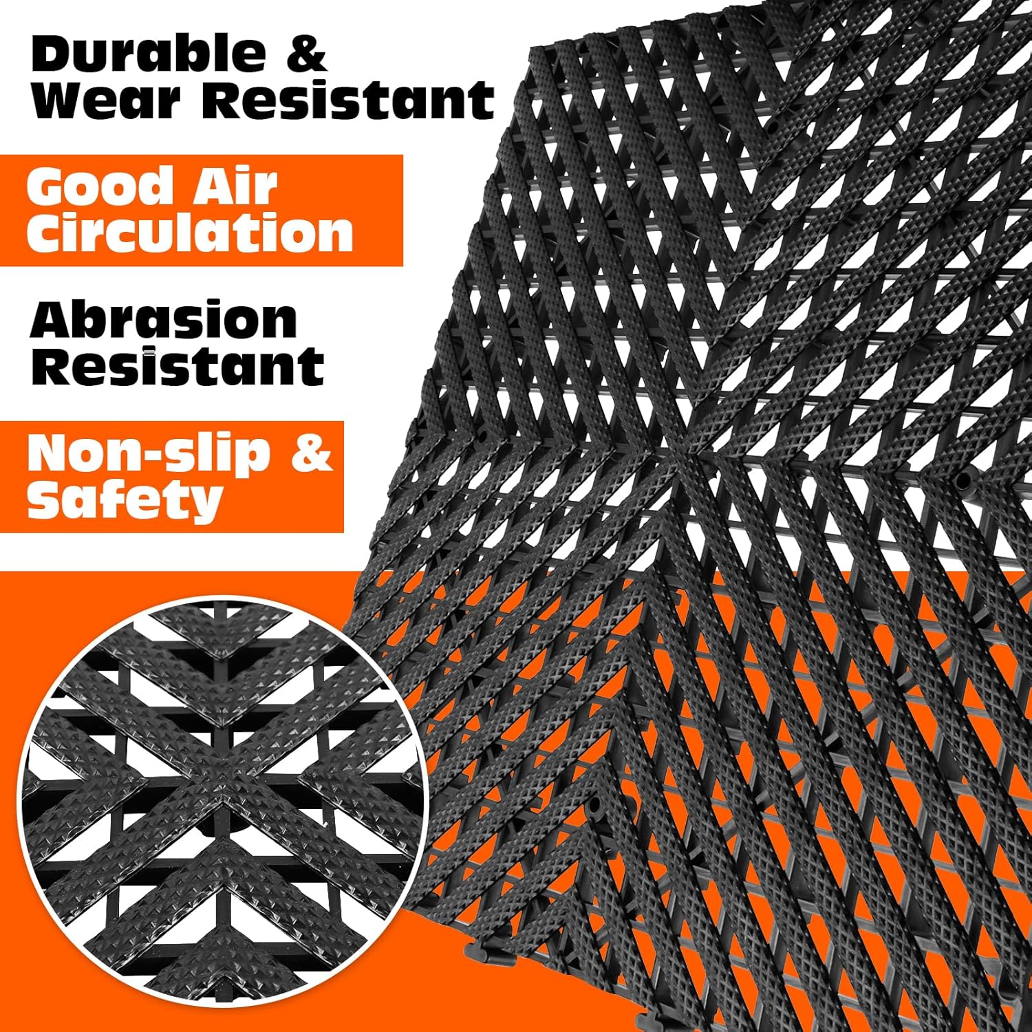 - MULTIPURPOSE APPLICATION: Upgrade any indoor or outdoor area with these versatile interlocking floor tiles. Perfect for garages, patios, decks, walkways, gazebos, and more, these tiles provide excellent traction and can be used in wet or damp areas, making them ideal for boats, kennels, and around pools.