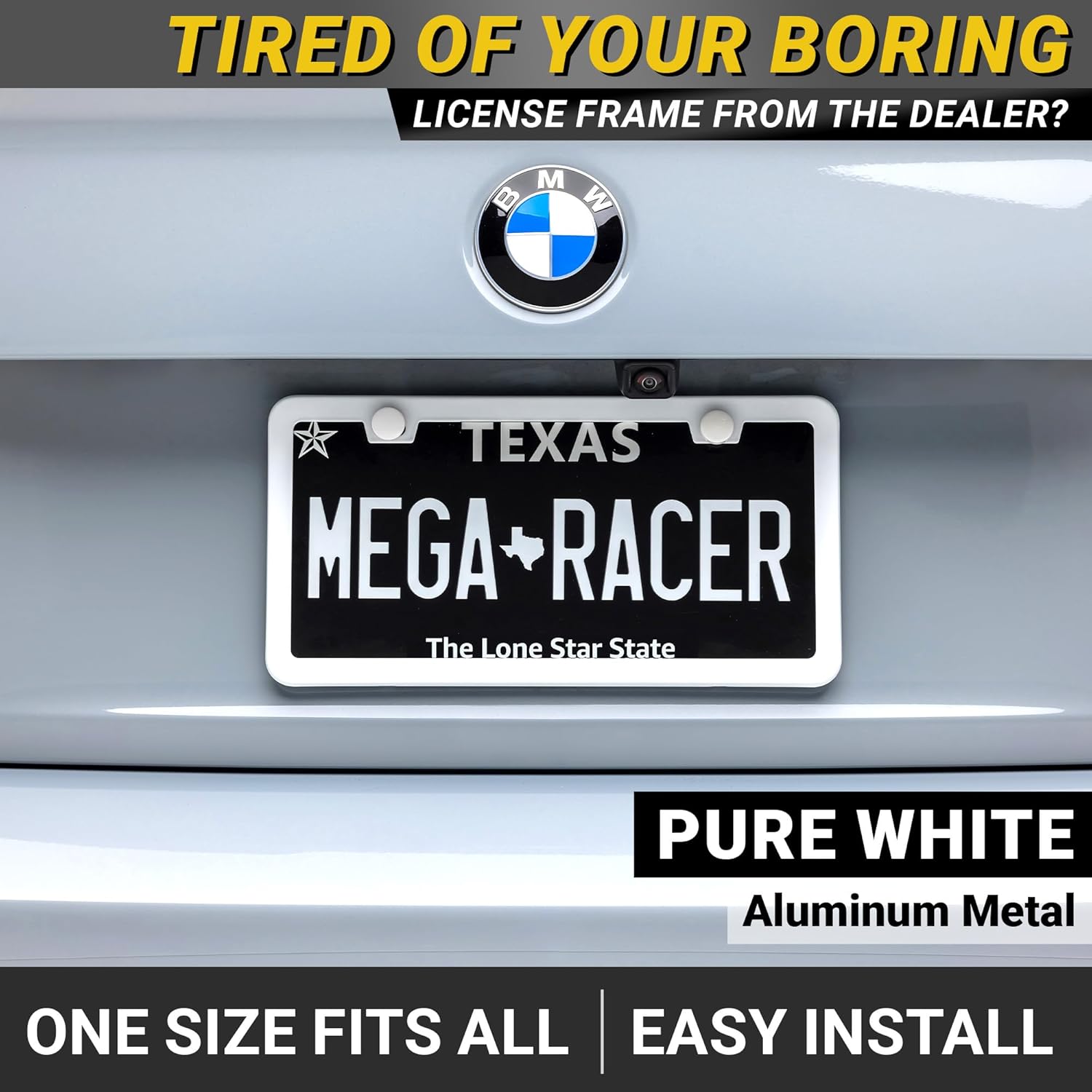 - STRONG DURABLE QUALITY: Our 2 pc License Plate Frame White Holder is made strong to uphold anything from car washes to weather changes. Mega Racer's white license plate frames are RATTLE PROOF and RUST RESISTANT keeping your vehicle paint SCRATCH FREE.
