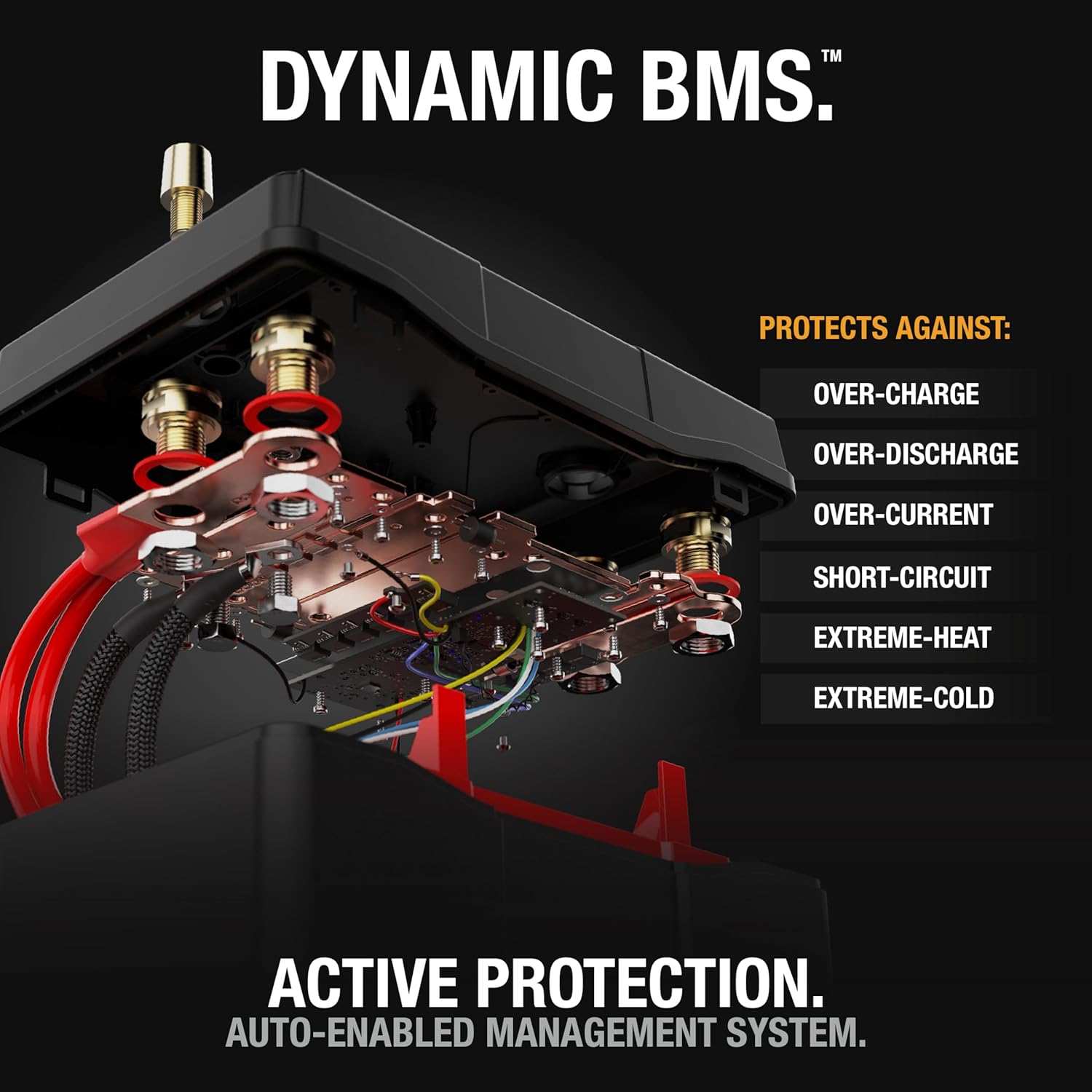 - DYNAMIC BMS — Built-in battery management system ensures safety and reliability with bidirectional cell balancing and protection from overcharge, overdischarge, short circuits, and more - plus active thermal monitoring with no resets required.