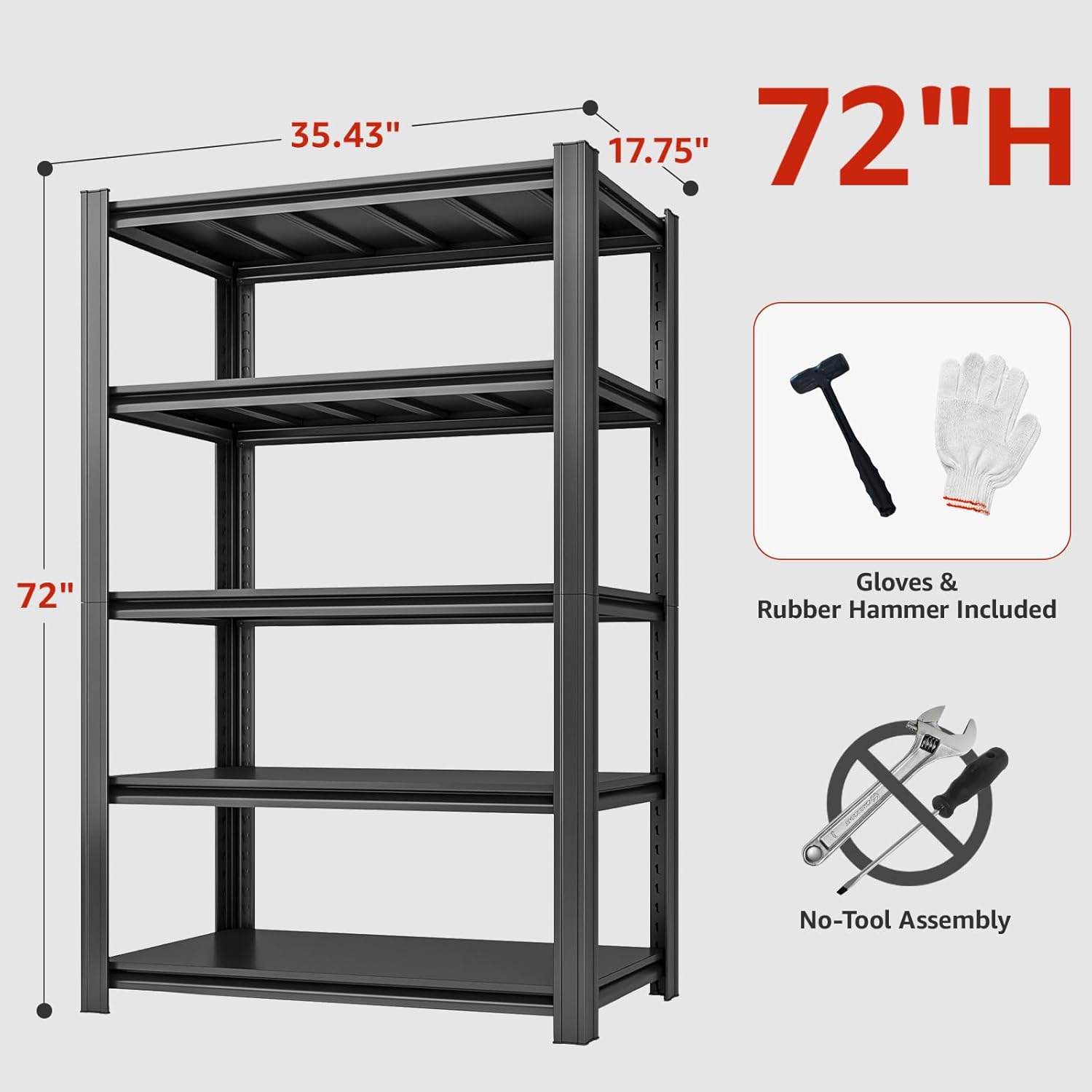 72" H Metal Garage Storage Shelves, 5 Tier Adjustable Shelving Unit for Warehouse, Office, Kitchen, Pantry, Living Room, Laundry Room, 35.43" W x 15.75" D, Load 2500 LBS, Black