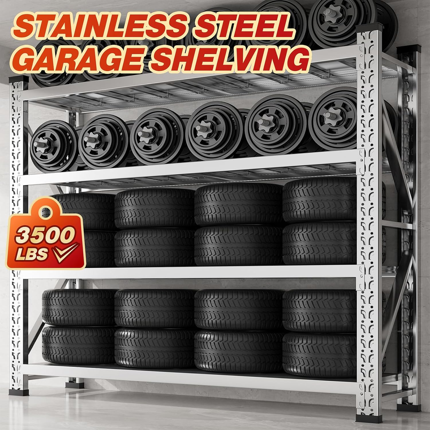 - 3500LBS High Cpacity - Each tier of the shelving unit can hold up to 875 lbs, showcasing its high capacity for heavy items. The cumulative weight capacity of 3500 lbs across all tiers solidifies its suitability for securely housing substantial tools, equipment, and a variety of items in your garage. Whether you're organizing a workshop or storage area, this stainless steel garage shelving combines strength, adaptability, and durability to meet your storage needs comprehensively.