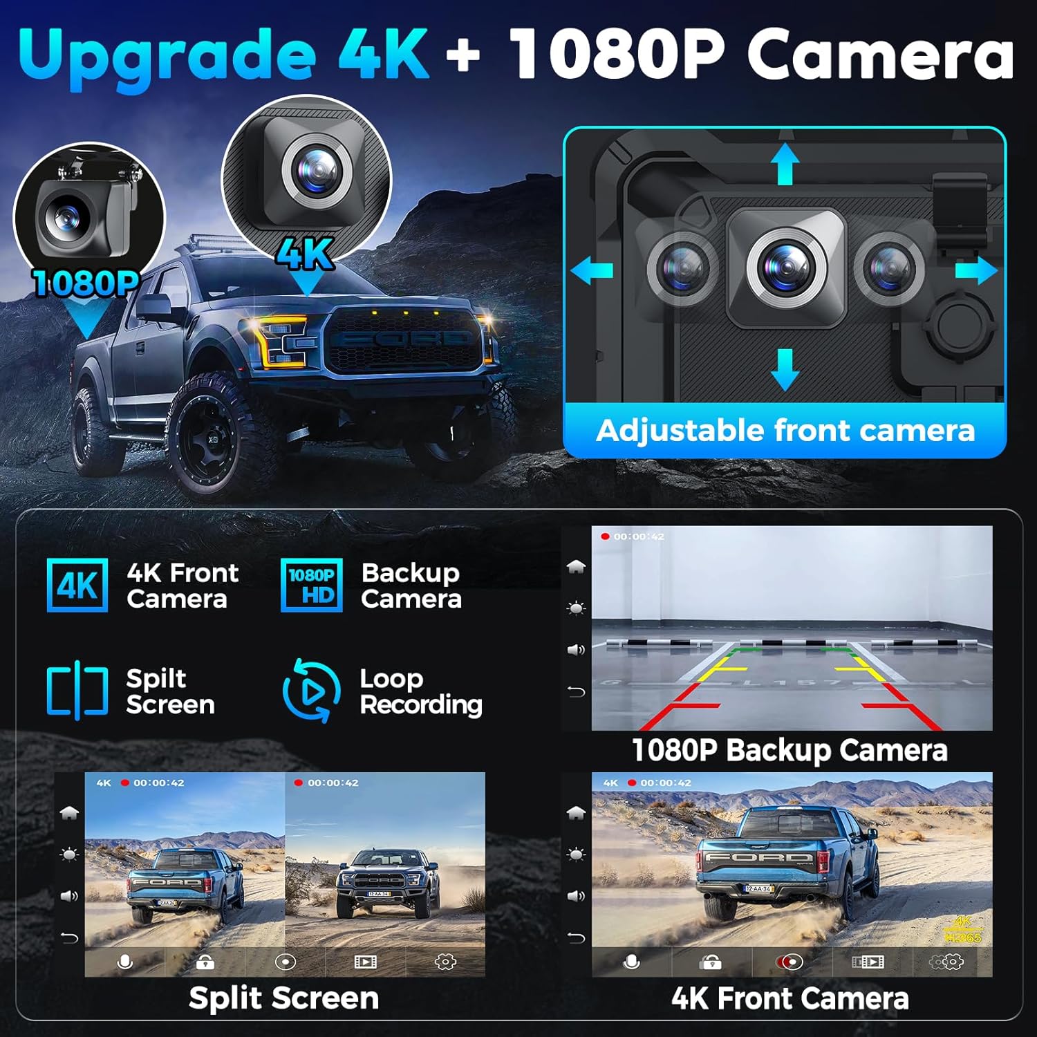 - 4K Dash Cam and 1080P Rear Camera: Experience superior 4K video quality and seamless recording with loop recording functionality. In the event of emergencies, the collision detection feature automatically safeguards videos to prevent deletion. Easily access and download recordings on your smartphone for added convenience. 64G SD card is included. (Tips: The card is already inserted in the head unit). Boost parking safety with the HD night vision rearview camera, offering a wide 170° viewing angle and waterproof design. The screen seamlessly switches to the reversing image when shifting into reverse, ensuring effortless parking.